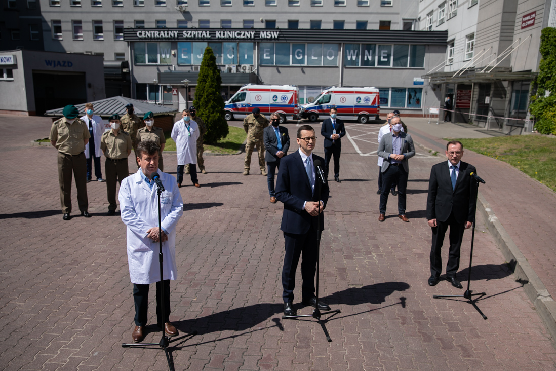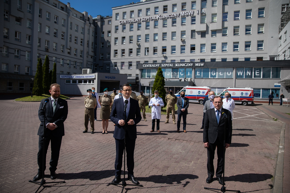 Premier Mateusz Morawiecki, minister spraw wewnętrznych i administracji Mariusz Kamiński oraz minister zdrowia Łukasz Szumowski wzięli udział we wtorkowej (2 czerwca br.) konferencji prasowej, podsumowującej działania związane z pandemią COVID-19. Podczas konferencji w Centralnym Szpitalu Klinicznym MSWiA w Warszawie podziękowano służbom za skuteczną walkę z koronawirusem.