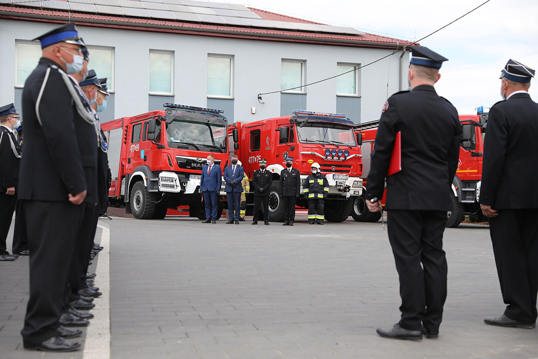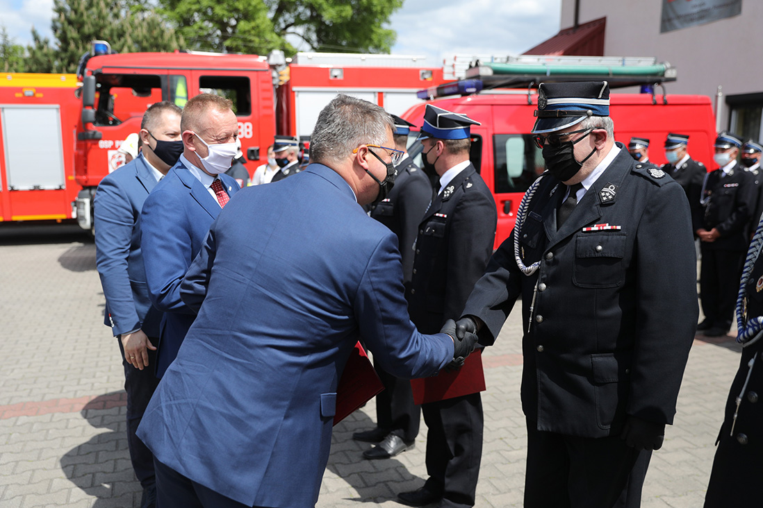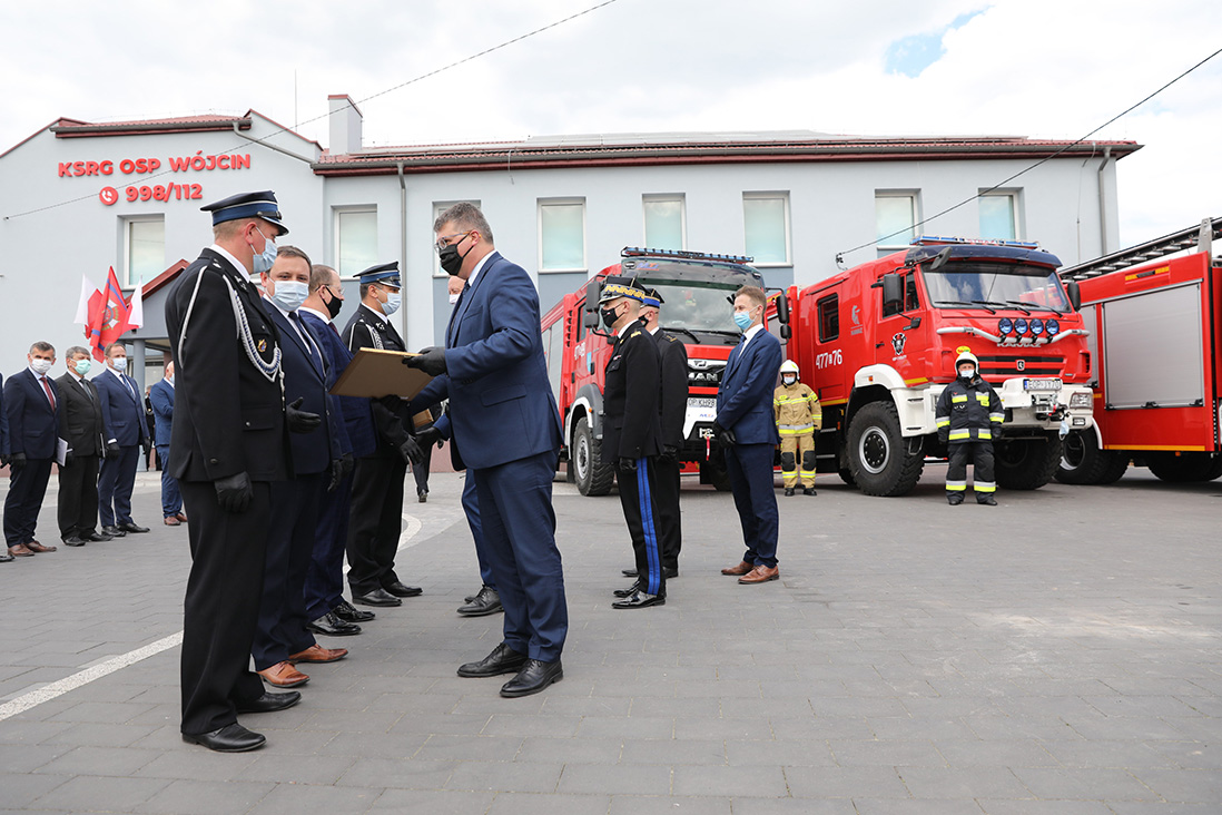 Podczas uroczystości w Wójcinie wiceszef MSWiA wręczył przedstawicielom OSP promesy 5000+ w ramach środków Funduszu Przeciwdziałania Covid-19. Wiceminister Maciej Wąsik przekazał OSP także klucze do nowych wozów ratowniczo-gaśniczych oraz wręczył akty włączenia jednostek OSP do Krajowego Systemu Ratowniczo-Gaśniczego.