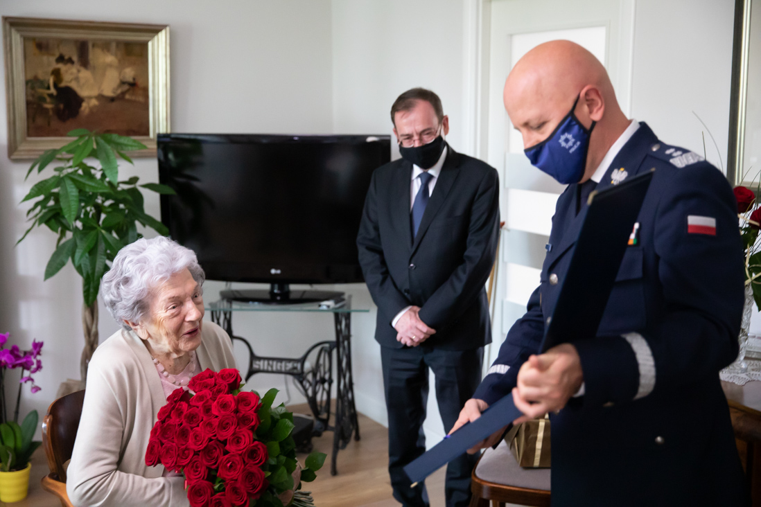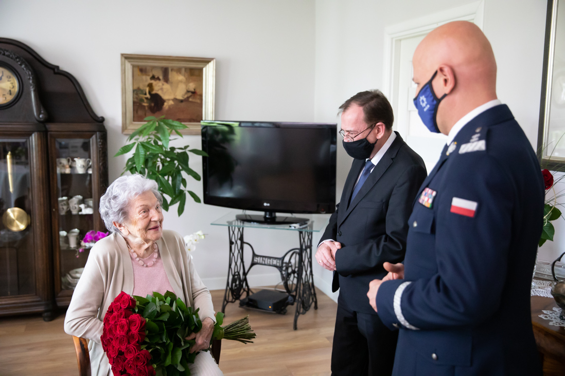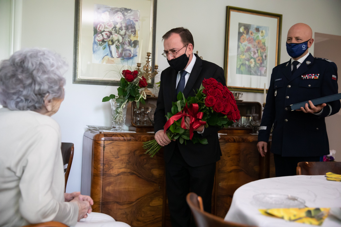Podczas urodzinowej wizyty minister Mariusz Kamiński oraz komendant Jarosław Szymczyk wręczyli pani Marii kwiaty i upominki.