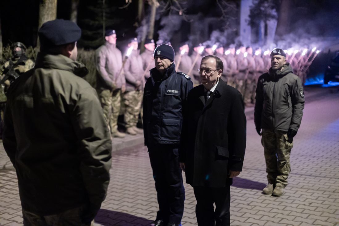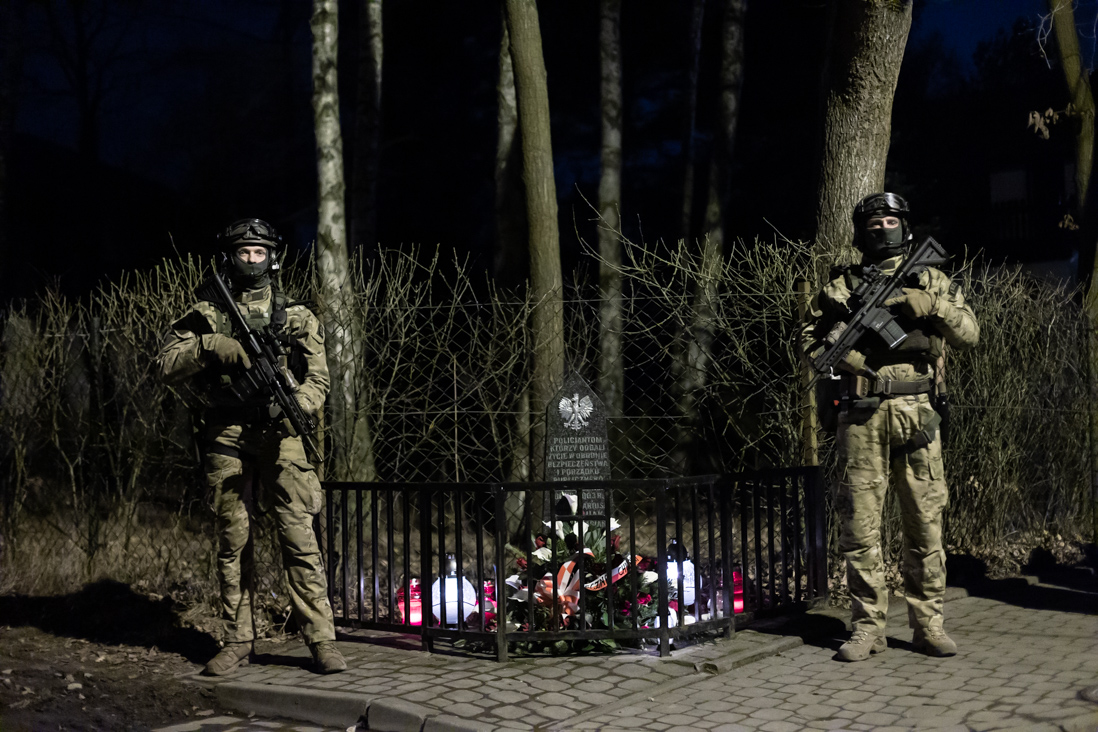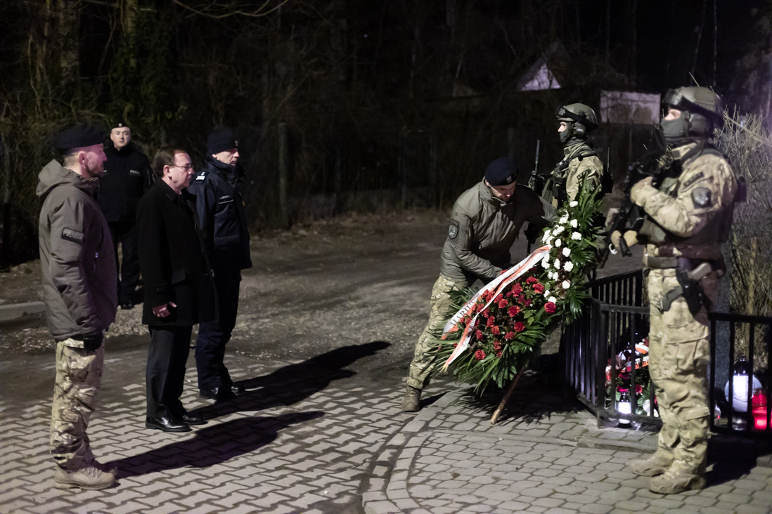Minister Mariusz Kamiński razem z gen. insp. Jarosławem Szymczykiem, komendantem głównym Policji oraz insp. Dariuszem Ziębą, dowódcą Centralnego Pododdziału Kontrterrorystycznego Policji BOA, złożyli w nocy w Magdalence wieniec pod pomnikiem upamiętniającym poległych policjantów.