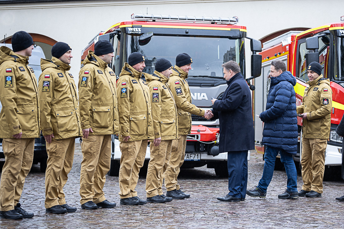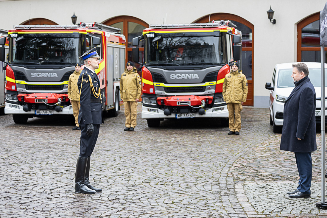 Podczas uroczystości w Warszawie minister Marcin Kierwiński wręczył dowódcom warszawskich jednostek ratowniczo-gaśniczych kluczyki i dokumenty do nowych pojazdów oraz podziękował za ich służbę.