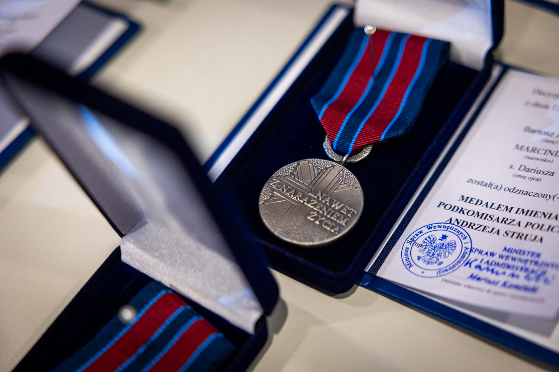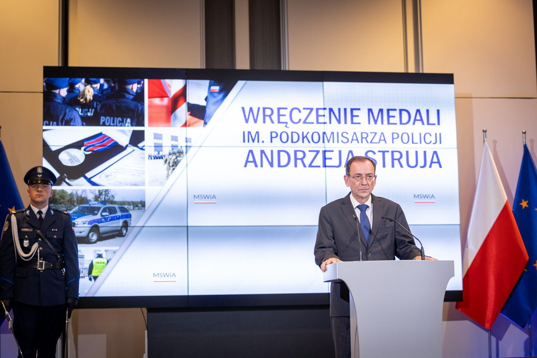 W piątek, 22 września br. Minister Spraw Wewnętrznych i Administracji Mariusz Kamiński wręczył Medale im. podkomisarza Policji Andrzeja Struja funkcjonariuszom z całego kraju, którzy bez wahania, z narażeniem własnego zdrowia i życia, ratowali innych. W uroczystości wzięli udział także wiceministrowie Błażej Poboży oraz Bartosz Grodecki, a także Komendant Główny Policji gen. insp. Jarosław Szymczyk i dyrektor generalny MSWiA Dariusz Nowak.