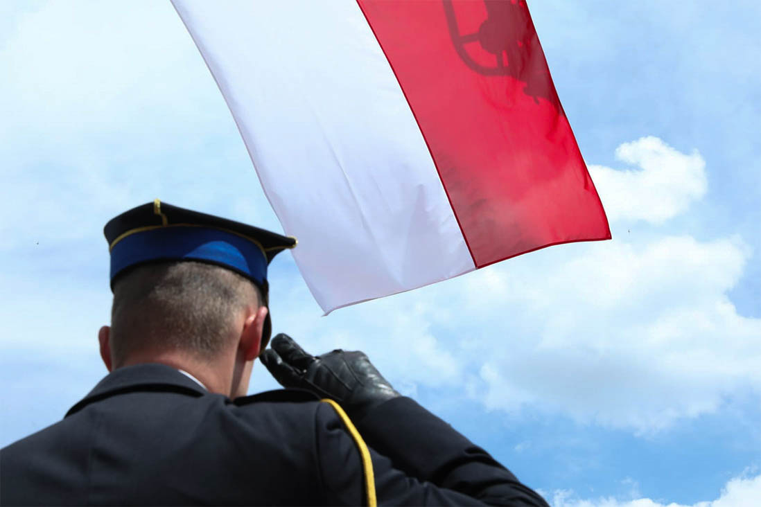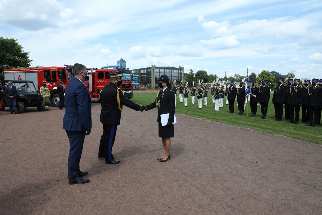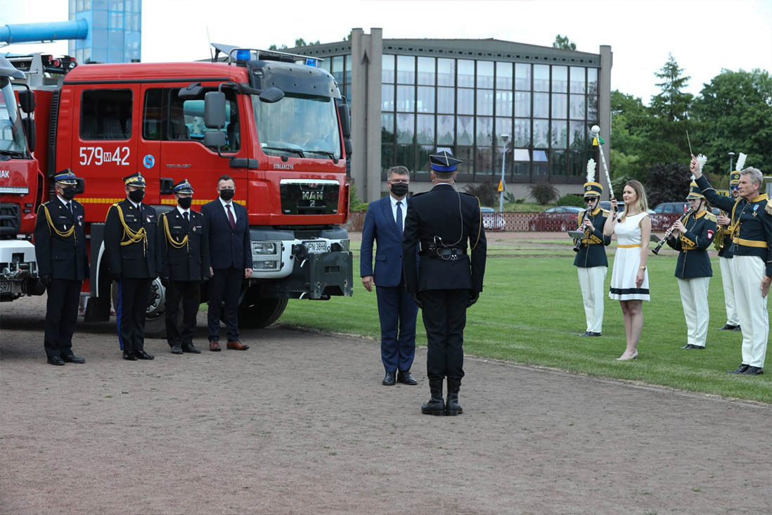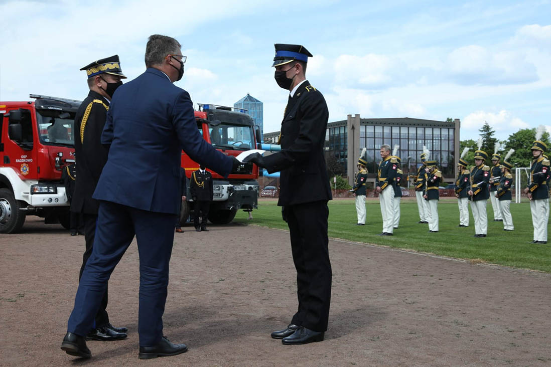 Wiceminister Maciej Wąsik wręczył też płońskim strażakom flagę państwową. Odebrał ją st. bryg. Dariusz Brzeziński, komendant powiatowy PSP w Płońsku.