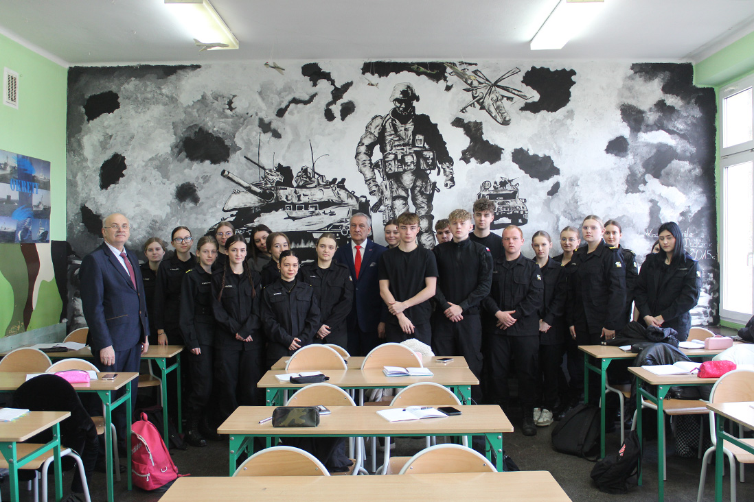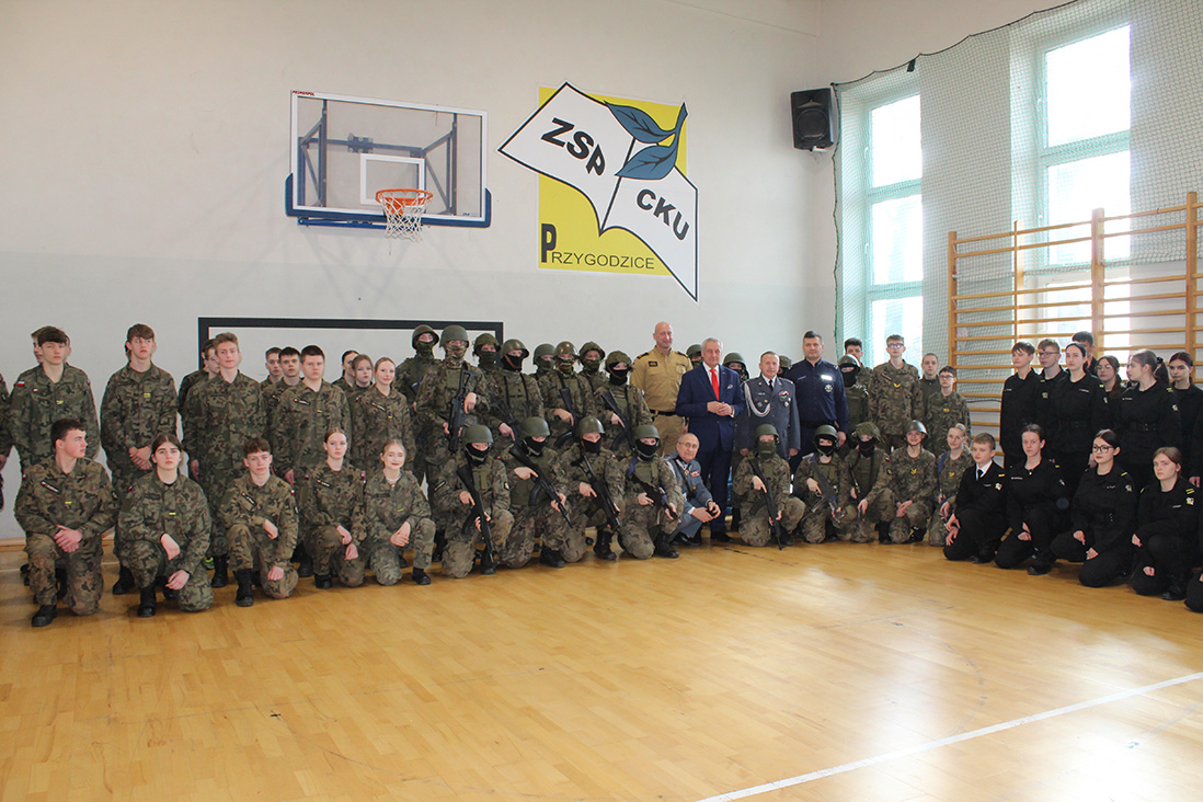 W poniedziałek, 17 marca br., wiceminister Wiesław Szczepański spotkał się uczniami klas mundurowych Zespołu Szkół Ponadpodstawowych Centrum Kształcenia Ustawicznego w Przygodzicach. Spotkanie związane było z jubileuszem 15-lecia utworzenia klas mundurowych w tej placówce.