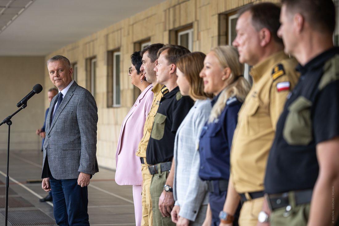 Szef MSWiA mówił o bezpieczeństwie w różnych wymiarach. Od tego w ruchu drogowym przez bezpieczeństwo granicy po zagrożenia akcjami dywersyjnymi. Dziękował szefom służb za dbanie o porządek publiczny zgodnie z zadaniami przynależnymi ich formacjom. Wskazywał też, że finalizowane są prace rządowe nad ustawą o ochronie ludności i obronie cywilnej, która będzie zawierała rewolucyjne zmiany w sferze ochrony ludności.