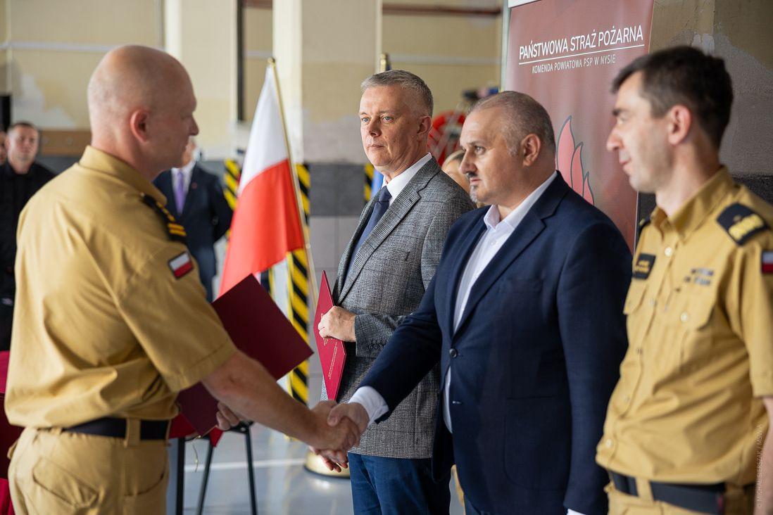 Szef MSWiA dziękował samorządowcom za współpracę nad przyszłą realizacją inwestycji. Przekonywał, że Nysa zasługuje na silne wsparcie ze strony państwa. Zaznaczył też w wystąpieniu, że straż pożarna jest na czele rankingów zaufania i w sposób szczególny dba o wysoki poziom bezpieczeństwa.
