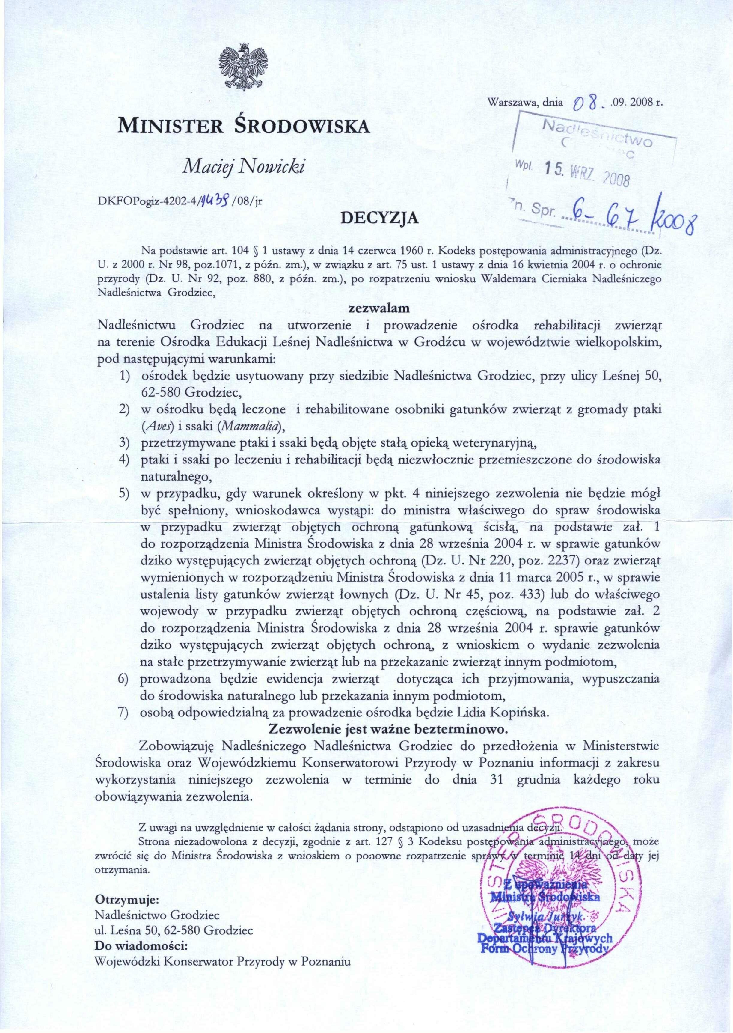 Zezwolenie Ministra Środowiska na utworzenie i prowadzenie Ośrodka Rehabilitacji ZwierzątZezwolenie_Ministra_Środowiska_na_utworzenie_i_prowadzenie_Ośrodka_Rehabilitacji_Zwierząt.jpg 0.84MB Wykaz danych o dokumentach zawierających informację o środowisku i jego ochronie w Nadleśnictwie Grodziec