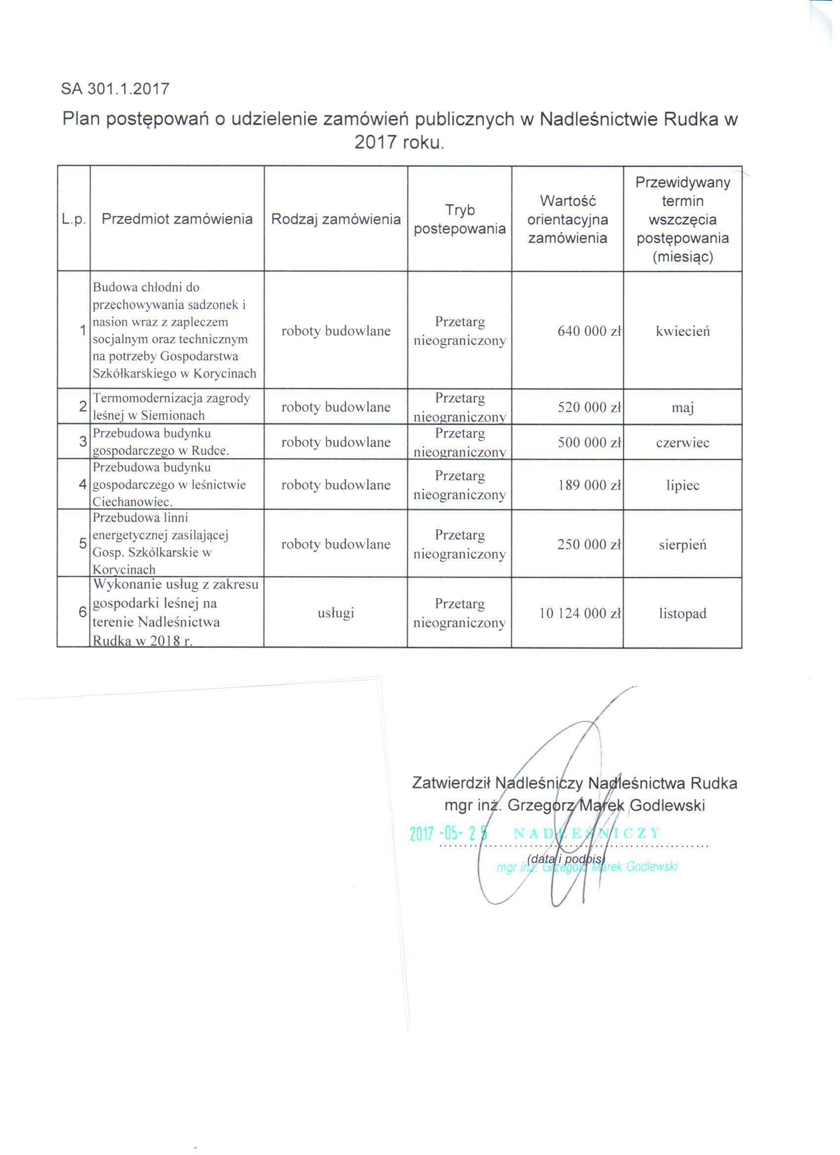 Plan postępowań o udzielenie zamówień publicznych w Nadleśnictwie Rudka w 2017r.