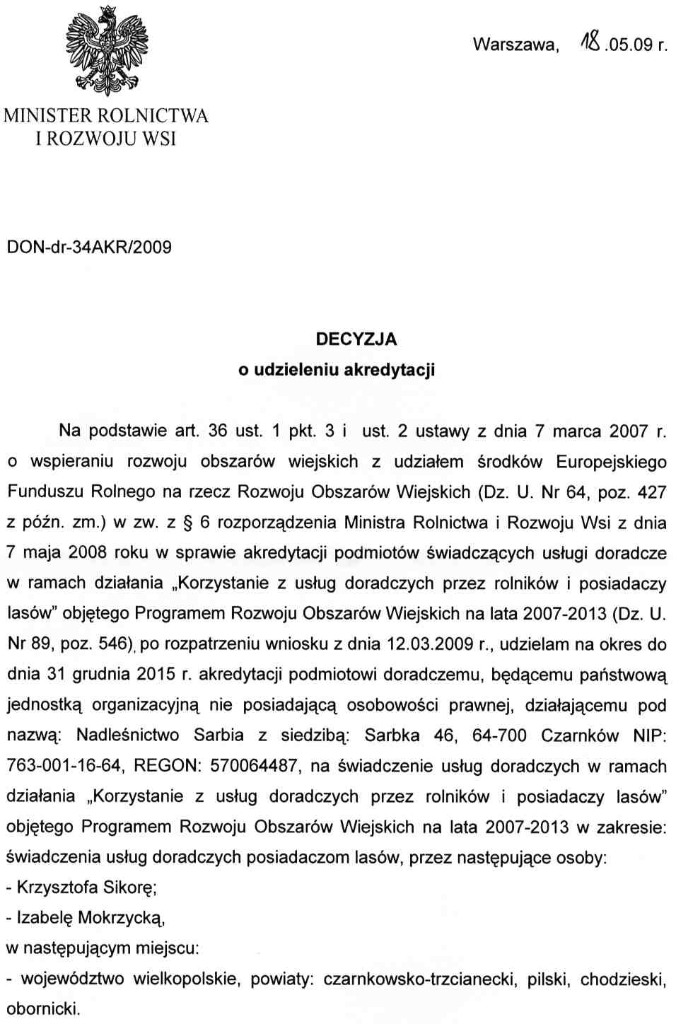Decyzja Ministra Rolnictwa i Rozwoju Wsi o udzieleniu akredytacji z dn. 18.05.2009decyzja_ministra_rolnictwa_i_rozwoju_wsi_o_udzieleniu_akredytacji_z_dn_18052009.jpg 0.09MB Uzasadnienie Decyzji o udzieleniu akredytacji str. 1