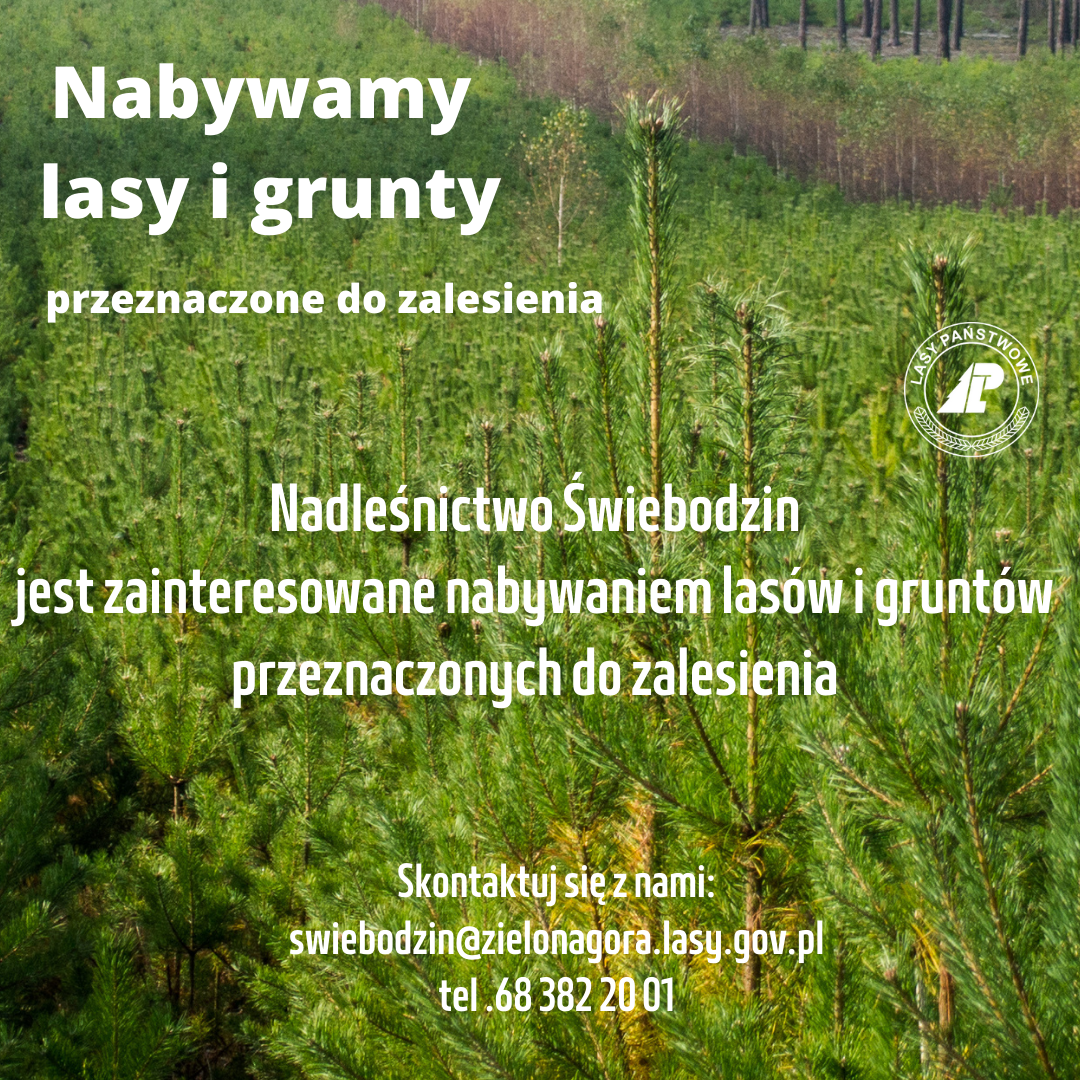 Lasy Państwowe rozpoczynają ogólnopolską akcję skupu gruntów pod nowe lasy. Zachęcamy wszystkich właścicieli gruntów, na których może powstać las, aby zgłosili się do Nadleśnictwa Świebodzin z ofertą sprzedaży.