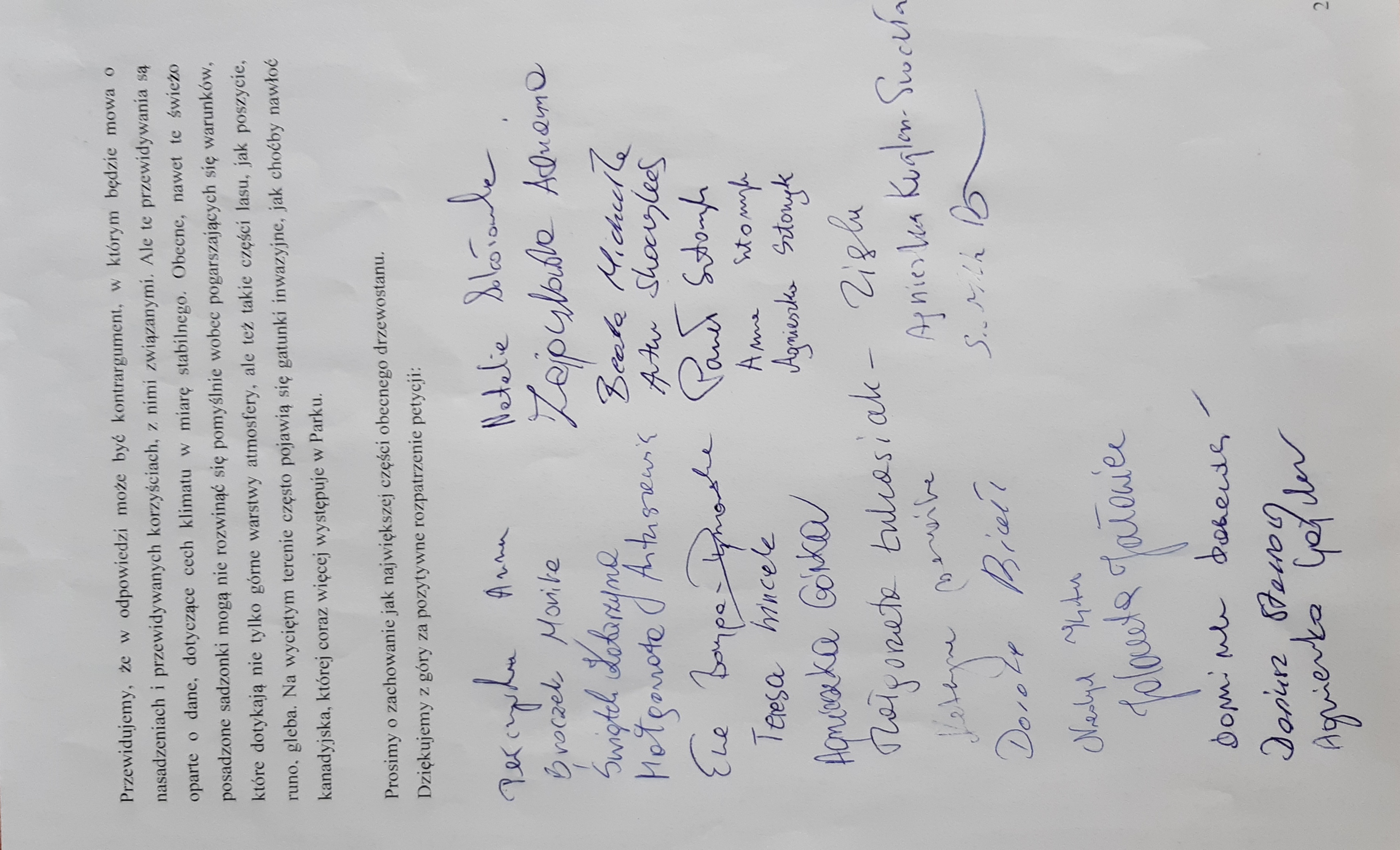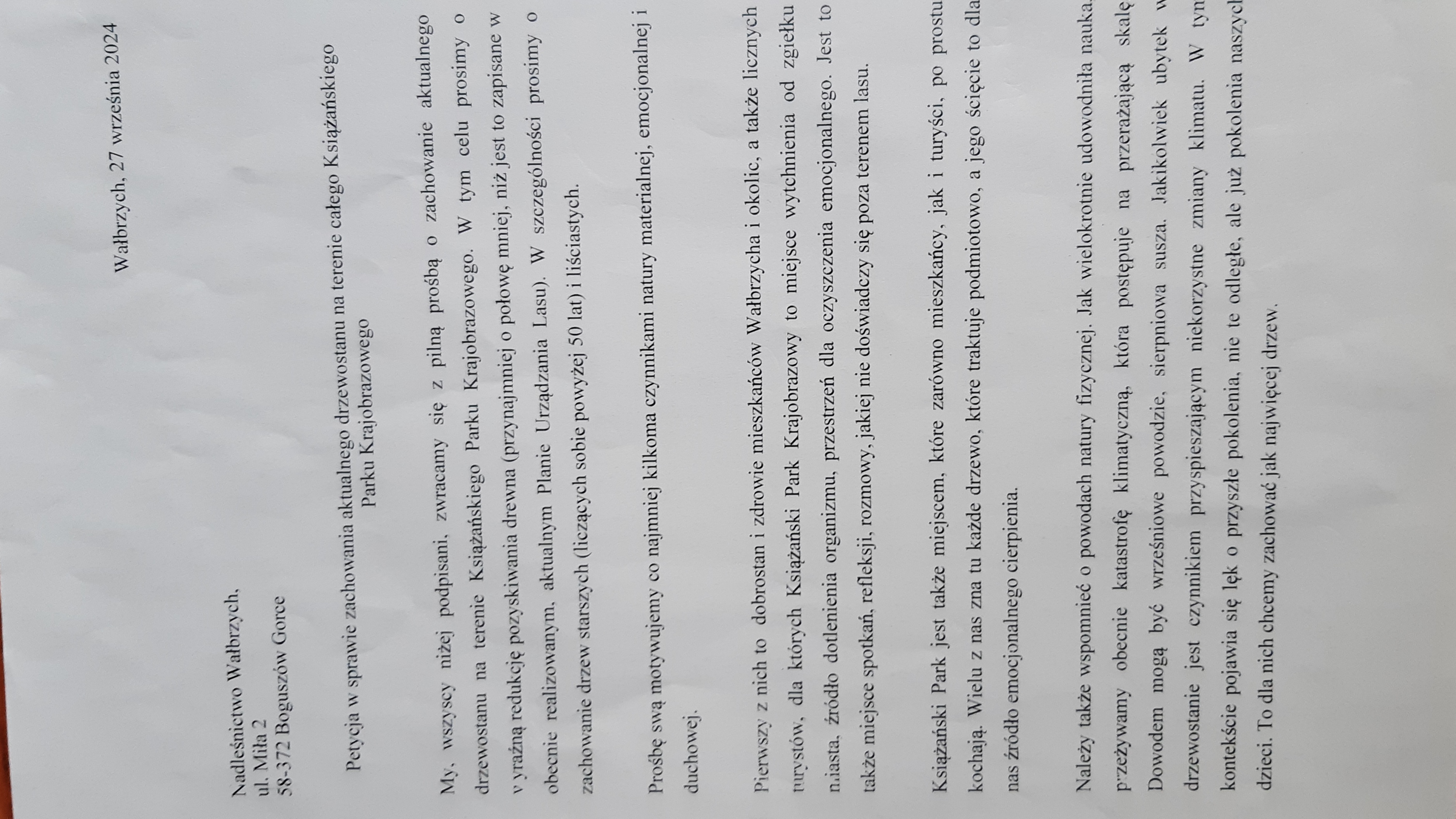 Do Nadleśnictwa Wałbrzych wpłynęła petycja w sprawie zachowania aktualnego drzewostanu na terenie całego Książańskiego Parku Krajobrazowego . Zgodnie z art. 8 ust. 1. Ustawy o petycjach (Dz.U. 2018. poz. 870) na stronie internetowej podmiotu rozpatrującego petycję lub urzędu go obsługującego niezwłocznie zamieszcza się informację zawierającą odwzorowanie cyfrowe (skan). Z treścią petycji można się zapoznać poniżej - plik do pobrania.