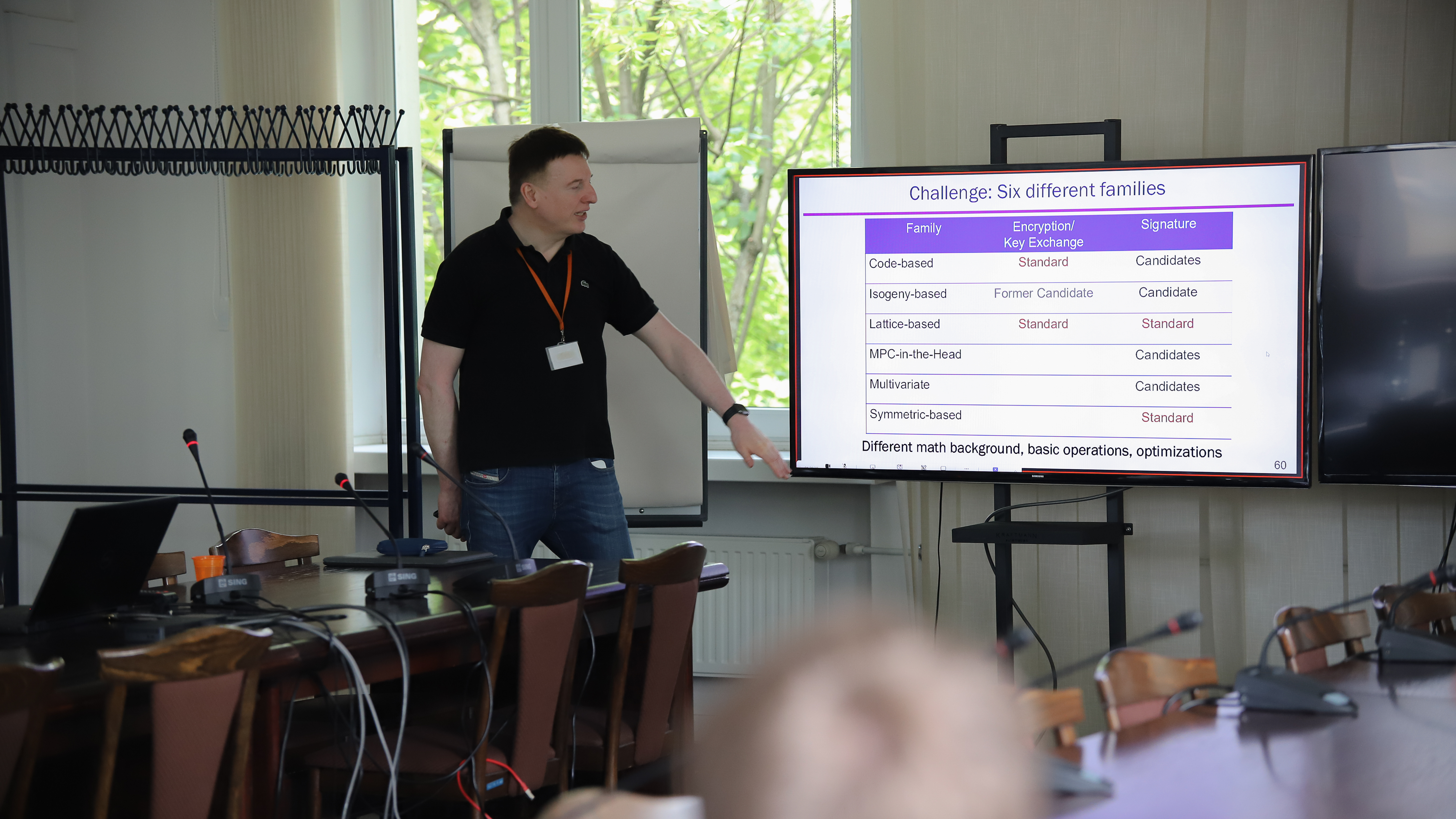 The discussion with participants gathered in the room and online included issues such as hardware implementation security, particularly the algorithm's resistance against side-channel attacks, and hybrid solutions (i.e., parallel usage of classical and post-quantum cryptography) in massive trust services.