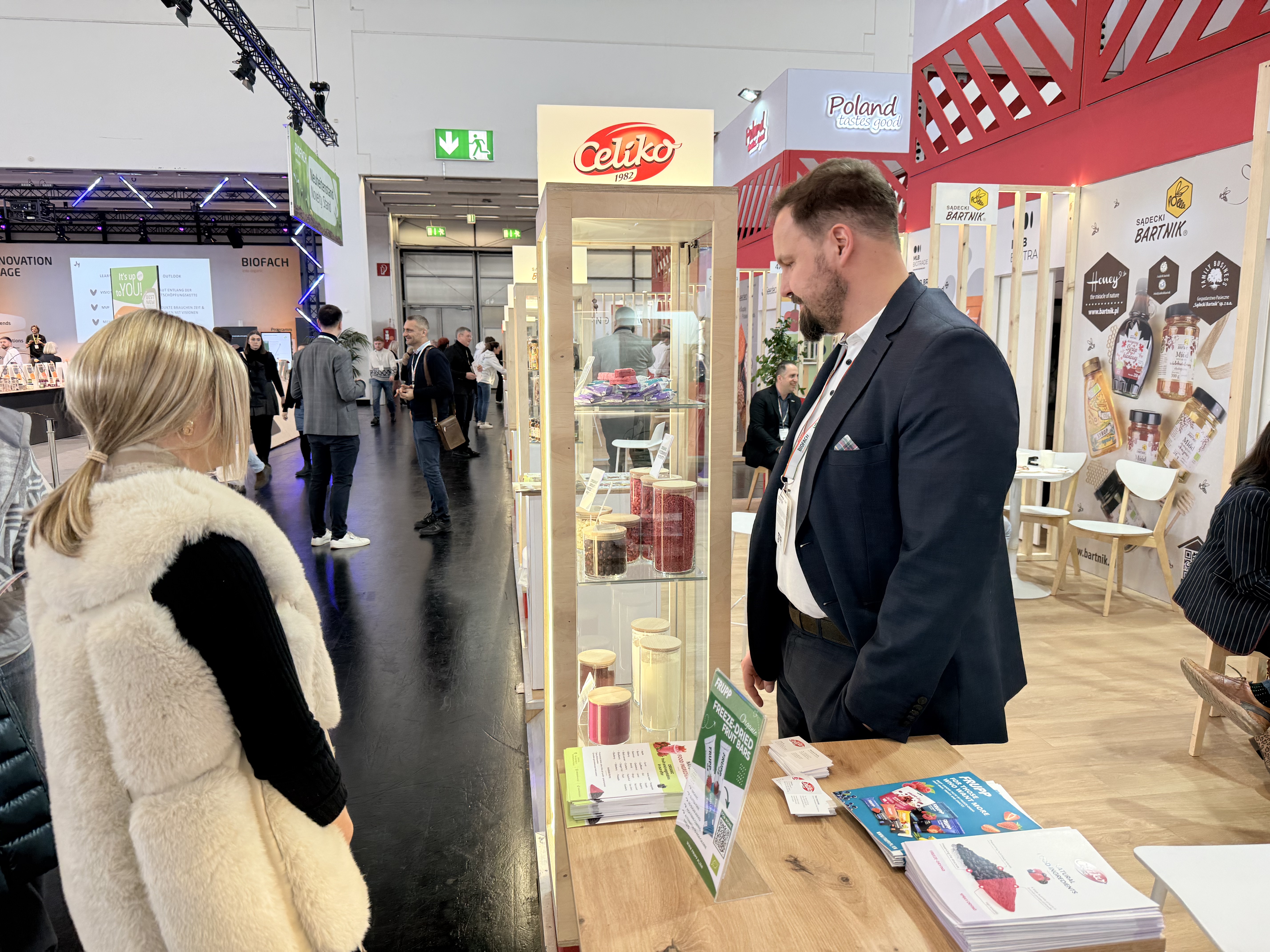 At the Polish stand, 17 companies from the organic food and beverage industry promote a large variety of their products. Clients and visitors can explore a wide range of organic products, including fresh apples, frozen fruit and vegetables, freeze-dried fruit and vegetable snacks, juices and beverages, gluten-free products, processed grains, bakery products, honey, and herbs.