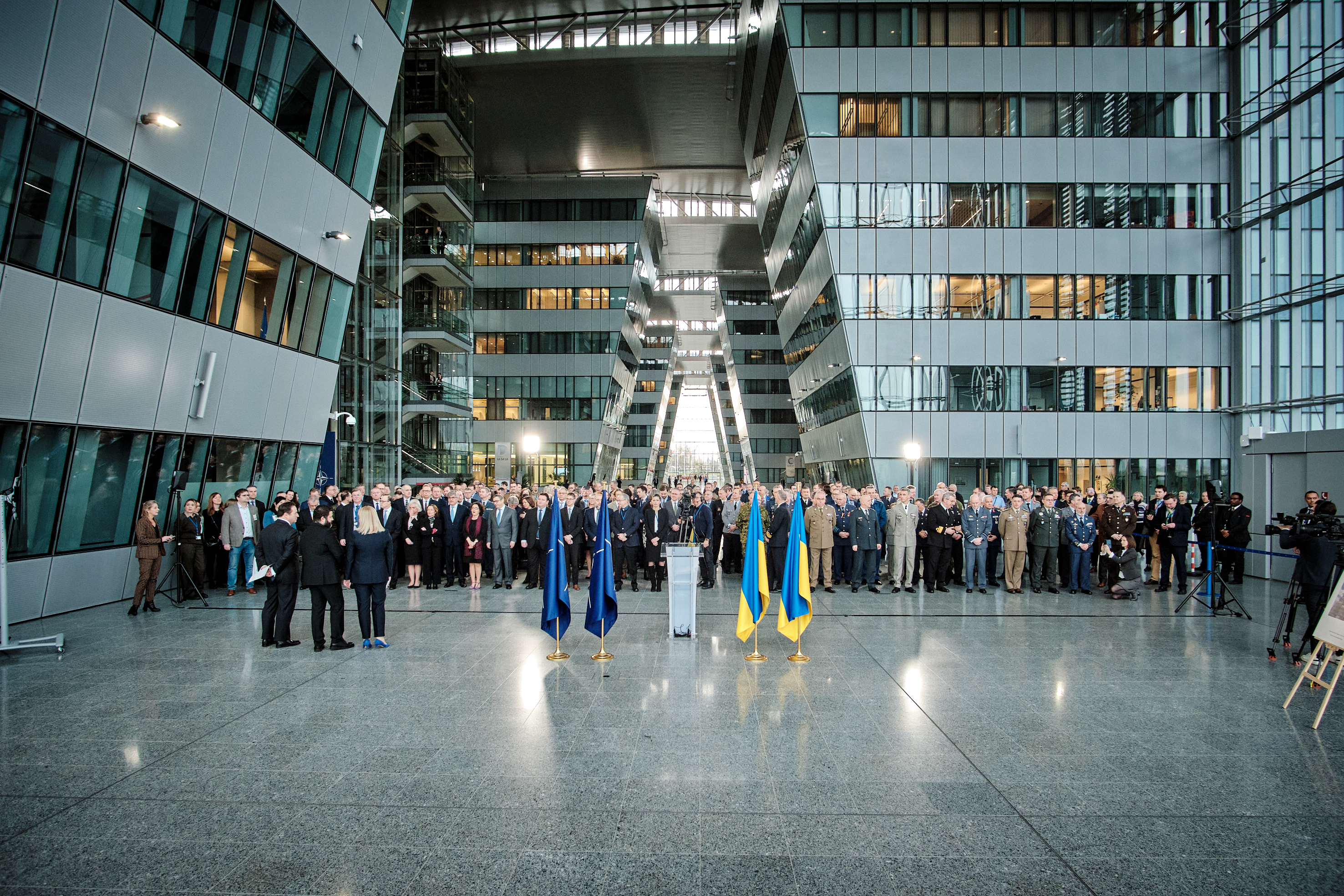 One year after the Russian armed aggression against Ukraine and the start of a full-scale war, a ceremony was held at NATO Headquarters to commemorate the victims of Russian terror and to pay tribute to the defenders of Ukraine. The event was organized by the Permanent Representation of the Republic of Poland to NATO and the Romanian and Ukrainian Delegations to NATO.
