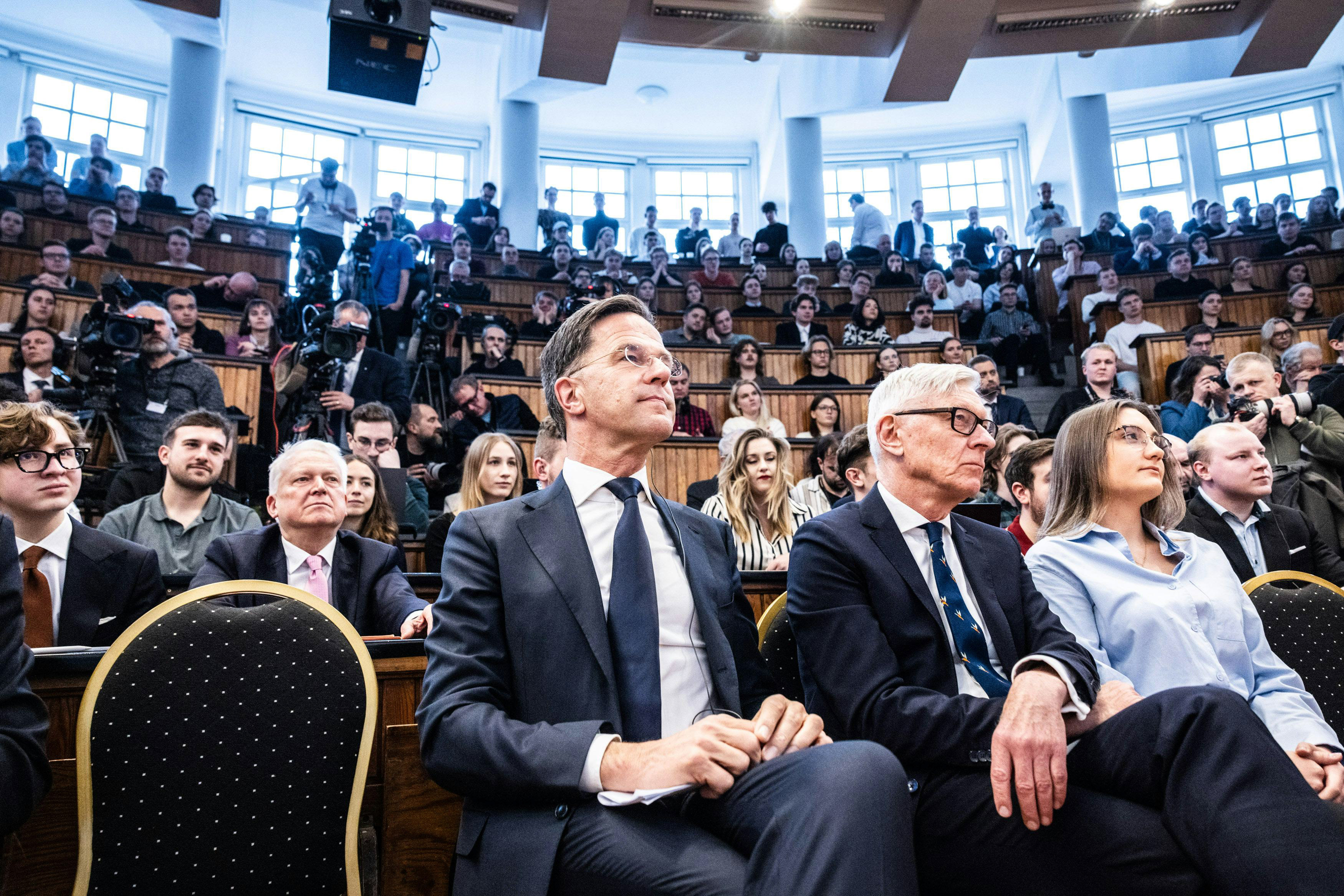 Po spotkaniach z przedstawicielami polskich władz Sekretarz Generalny wygłosił odczyt w Szkole Głównej Handlowej w Warszawie. Podkreślił, że niezależnie od końca wojny, Rosja pozostanie najważniejszym i bezpośrednim zagrożeniem dla naszego bezpieczeństwa. Zapewnił, że Stany Zjednoczone podtrzymują swoje zobowiązania sojusznicze, a jedność NATO jest zachowana. Sekretarz Generalny zapowiedział również, że po szczycie w Hadze NATO będzie jeszcze silniejsze i bardziej śmiercionośne, z bardziej sprawiedliwym podziałem obowiązków. Czerwcowe spotkanie szefów państw i rządów będzie też okazją do podjęcia decyzji o dalszym wzmocnieniu sojuszniczych zdolności wojskowych, w tym w obszarze obrony powietrznej i sił lądowych. M. Rutte poinformował, że wybrał Polskę jako miejsce swojego wystąpienia, aby podkreślić wyjątkowe działania naszego kraju na rzecz bezpieczeństwa Sojuszu.