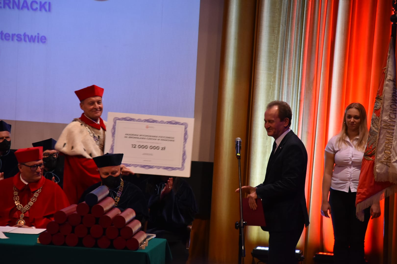 Podczas wydarzenia wiceminister edukacji i nauki wręczył czek o wartości ok. 12 mln zł na ręce Rektora prof. dr. hab. Andrzeja Klimka oraz dyplom uznania. Sekretarz Stanu w MEiN podziękował także całemu środowisku akademickiemu za ciężką pracę i wysiłek w okresie pandemii.