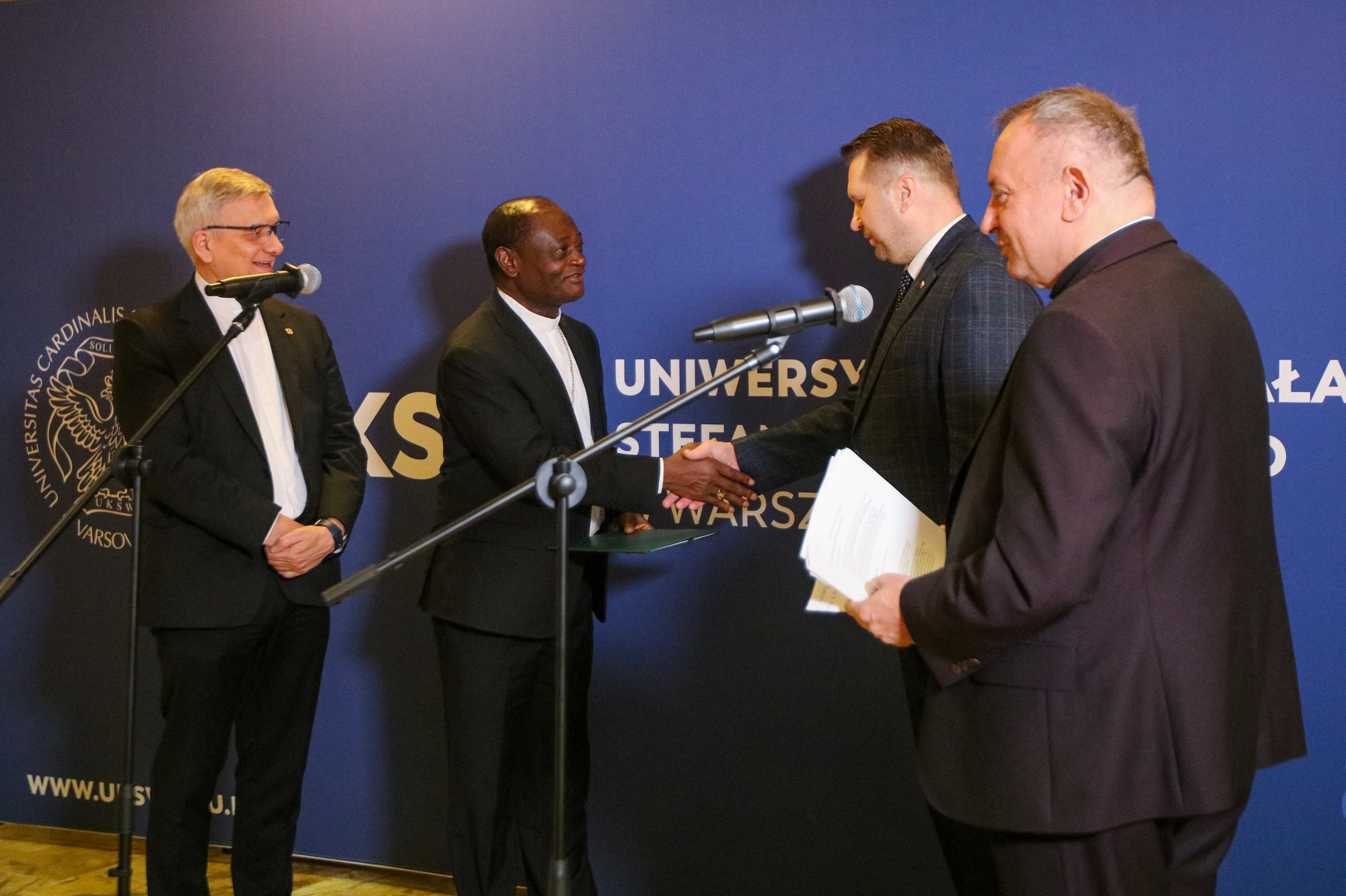 Rektor UKSW ks. prof. Ryszard Czekalski zaznaczył, że uczelnia od wielu lat włącza się w globalny proces kształcenia i wspierania studentów z Afryki. Jednym z etapów tego procesu jest dzisiejsza obrona prac doktorantów z Kamerunu: – Dzisiaj finalizowaliśmy pewien proces edukacyjny związany z kształceniem studentów, doktorantów z Afryki – wyjaśnił.