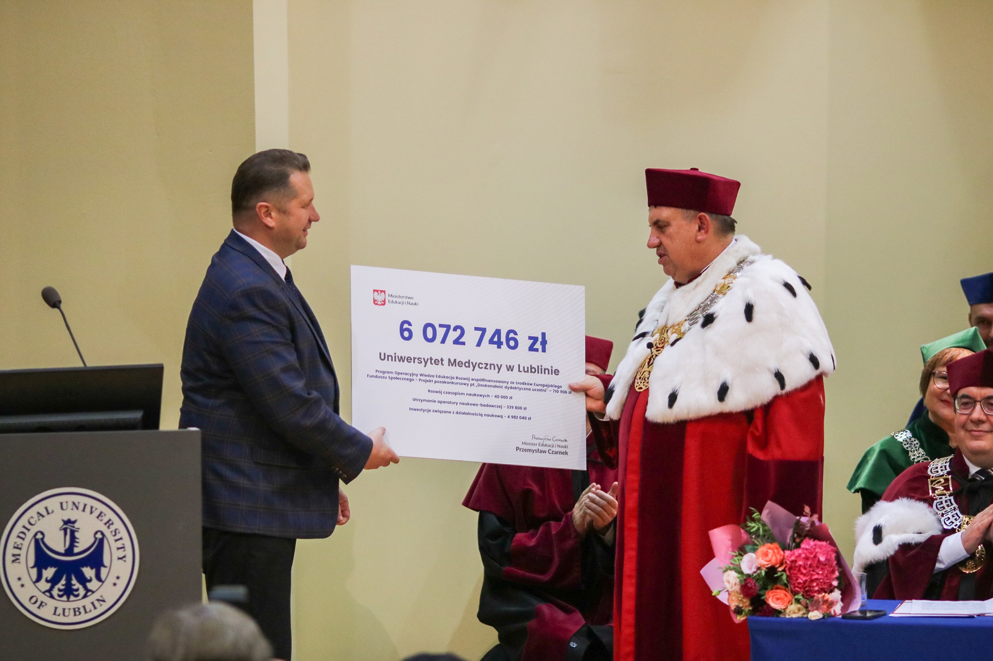 Podczas uroczystości Minister Edukacji i Nauki przekazał na ręce Rektora Uniwersytetu Medycznego prof. dr. hab. Wojciecha Załuski symboliczny czek na kwotę ponad 6 mln zł: