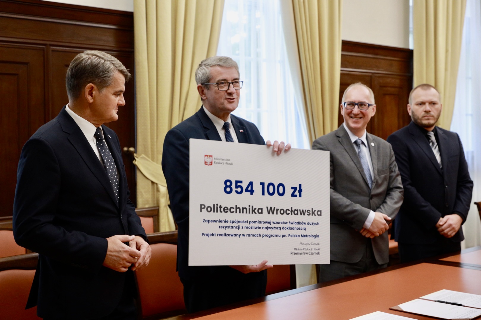 W ramach programu „Polska Metrologia” Politechnika Wrocławska będzie realizowała projekt „Zapewnienie spójności pomiarowej wzorców świadków dużych rezystancji z możliwie najwyższą dokładnością”. Na ten cel uczelnia otrzyma wsparcie z Ministerstwa Edukacji i Nauki w wysokości 850 tys. zł. Porozumienie o współpracy w ramach inicjatywy podpisali przedstawiciele Politechniki Wrocławskiej oraz Głównego Urzędu Miar. W wydarzeniu uczestniczył Sekretarz Stanu w MEiN Wojciech Murdzek.