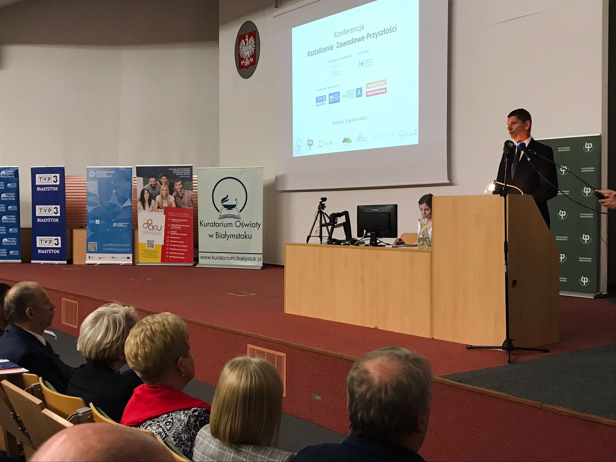 Wystąpienia ekspertów, panele tematyczne, targi umiejętności poświęcone edukacji zawodowej i warsztaty z doradztwa zawodowego – to najważniejsze punkty konferencji pt. „Kształcenie zawodowe przyszłości”. W wydarzeniu zorganizowanym na Politechnice Białostockiej wziął udział Sekretarz Stanu w MEiN Dariusz Piontkowski. Patronat honorowy nad przedsięwzięciem objął Minister Edukacji i Nauki.