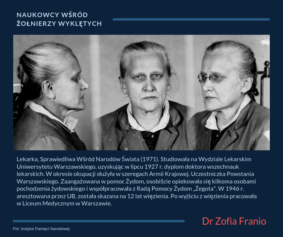 Dr Zofia Franio (1899–1978) ps. „Doktór”. Lekarka, Sprawiedliwa Wśród Narodów Świata (1971). Studiowała na Wydziale Lekarskim Uniwersytetu Warszawskiego, uzyskując w lipcu 1927 r. dyplom doktora wszechnauk lekarskich. W okresie okupacji służyła w szeregach Armii Krajowej. Uczestniczka Powstania Warszawskiego. Zaangażowana w pomoc Żydom, osobiście opiekowała się kilkoma osobami pochodzenia żydowskiego i współpracowała z Radą Pomocy Żydom „Żegota”. W 1946 r. aresztowana przez UB, została skazana na 12 lat więzienia. Po wyjściu z więzienia pracowała w Liceum Medycznym w Warszawie.