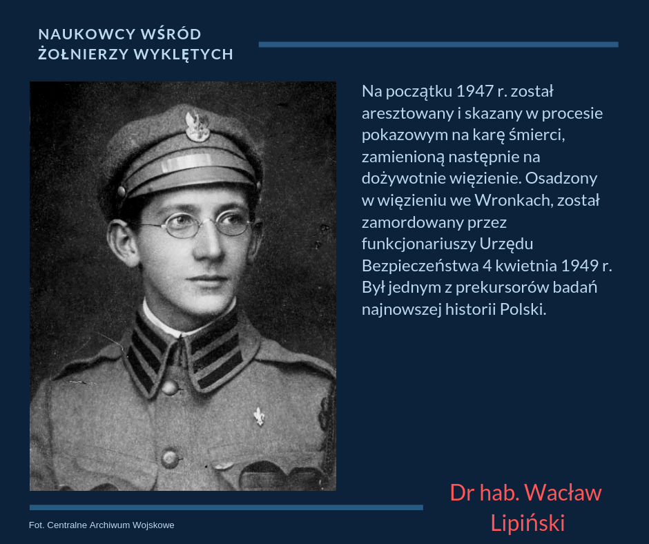 Dr hab. Wacław Lipiński (1896–1949) ps. „Socha”, „Aleksander”, żołnierz, historyk, podpułkownik Wojska Polskiego, doktor hab. historii, żołnierz pierwszej Brygady Legionów Polskich, uczestnik obrony Lwowa i wojny polsko-bolszewickiej. Historyk zmagań o niepodległość i granice II Rzeczypospolitej, dyrektor Instytutu Józefa Piłsudskiego w Warszawie, szef propagandy podczas wrześniowej obrony Warszawy, działacz antykomunistycznego podziemia niepodległościowego. Na początku 1947 r. został aresztowany i skazany w procesie pokazowym na karę śmierci, zamienioną następnie na dożywotnie więzienie. Osadzony w więzieniu we Wronkach, został zamordowany przez funkcjonariuszy Urzędu Bezpieczeństwa 4 kwietnia 1949 r. Był jednym z prekursorów badań najnowszej historii Polski. Opublikował wiele prac historycznych poświęconych zmaganiom o niepodległość i granice Rzeczypospolitej, wśród których najcenniejszą była Walka zbrojna o niepodległość Polski w latach 1905–1918. Za zasługi na polu wydawniczym uhonorowano go Srebrnym Wawrzynem Akademickim i dwukrotnie Złotym Krzyżem Zasługi. W 1937 r. otrzymał habilitację i docenturę na Uniwersytecie im. Jana Kazimierza we Lwowie.