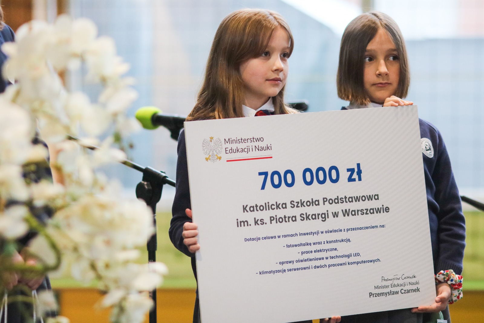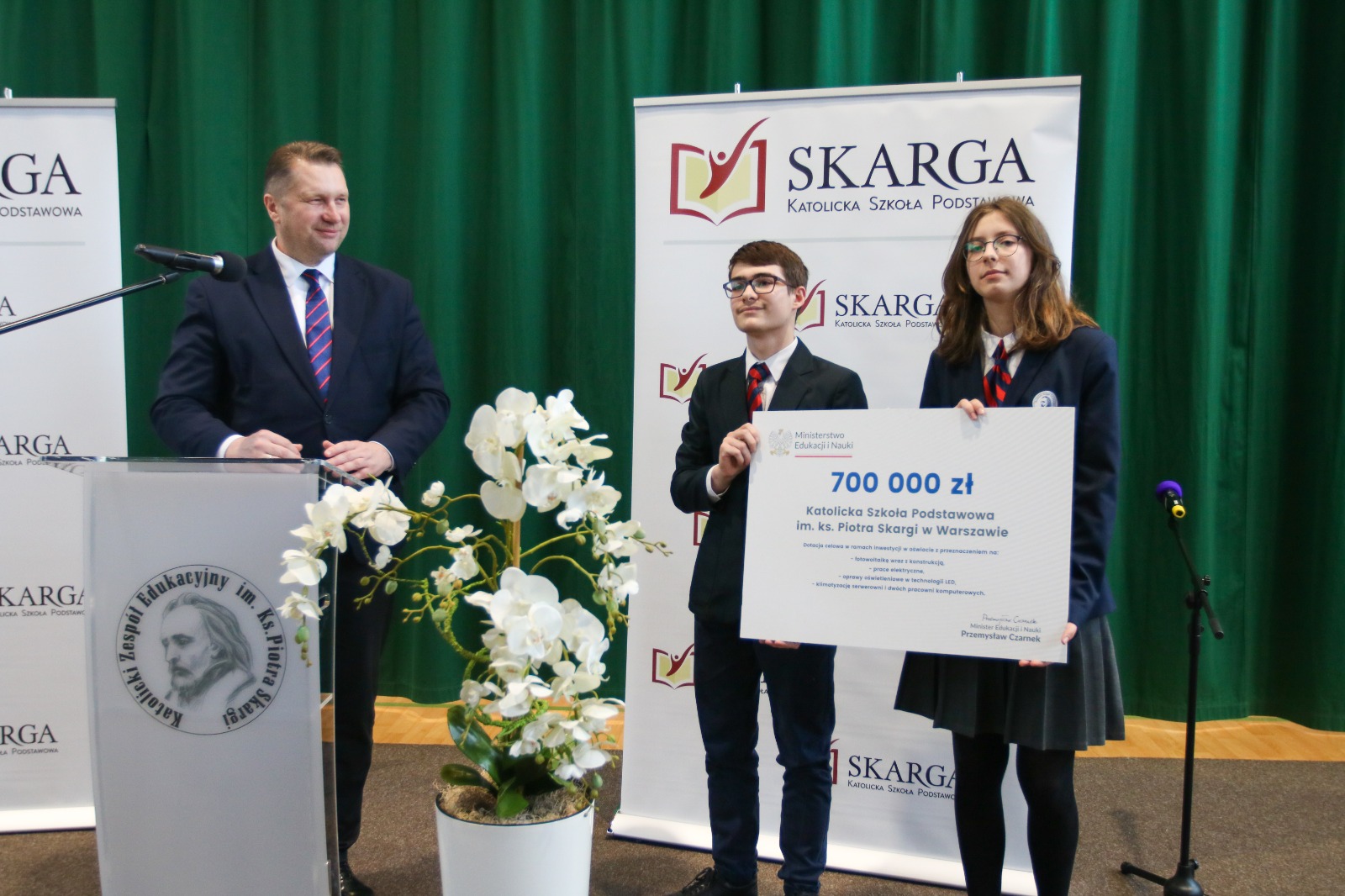Minister Edukacji i Nauki odwiedził Katolicką Szkołę Podstawową im. ks. Piotra Skargi w Warszawie. Podczas wizyty szef MEiN wręczył symboliczny czek na kwotę 700 tys. zł, którą placówka pozyskała w ramach programu „Inwestycje w oświacie”.