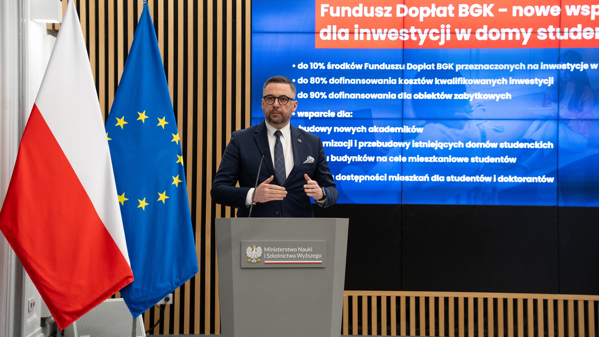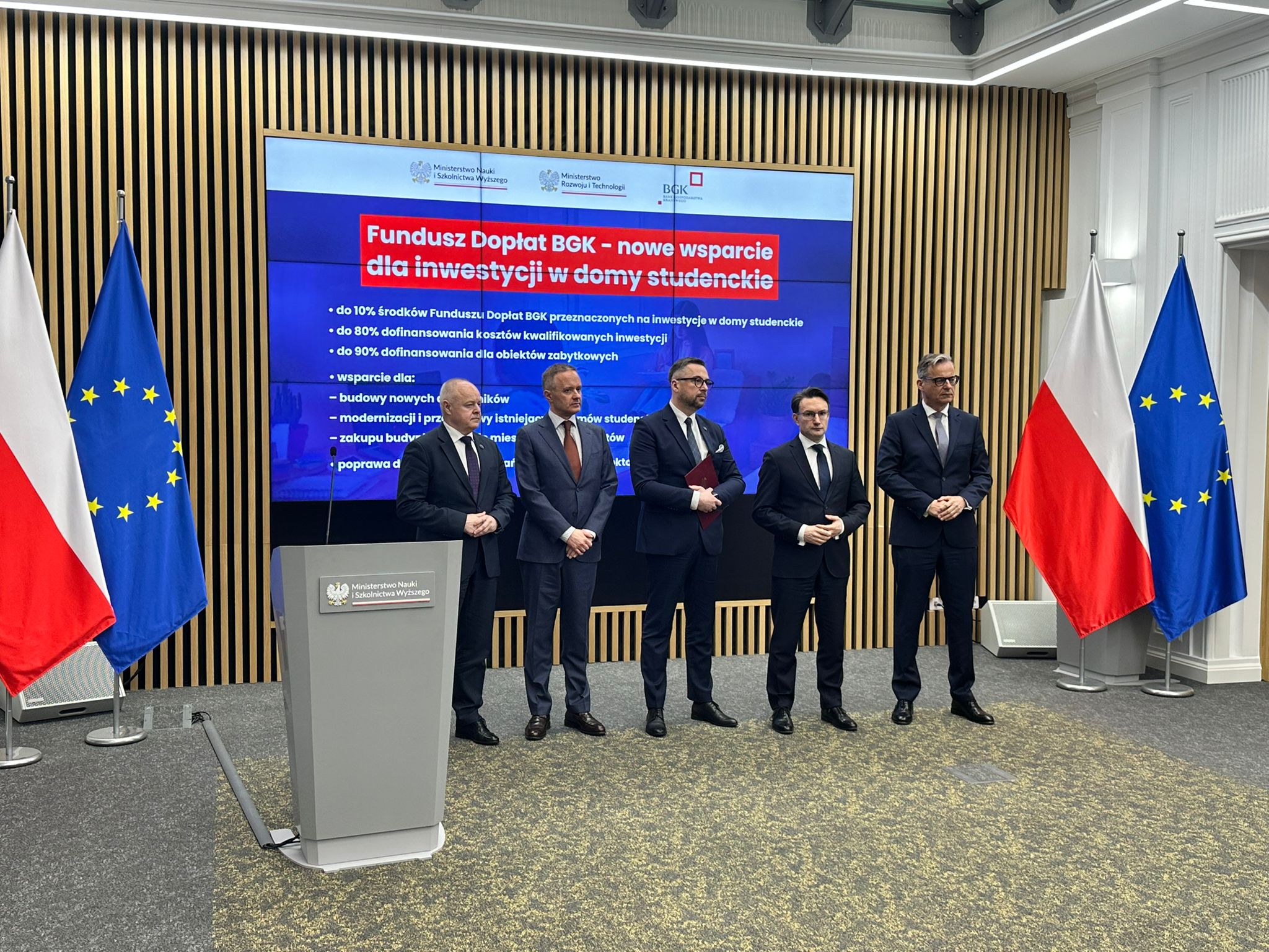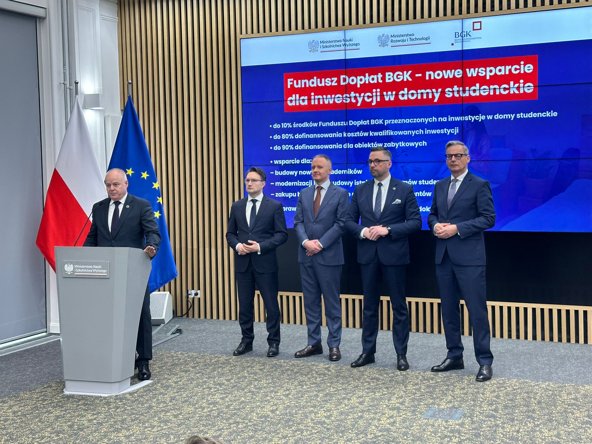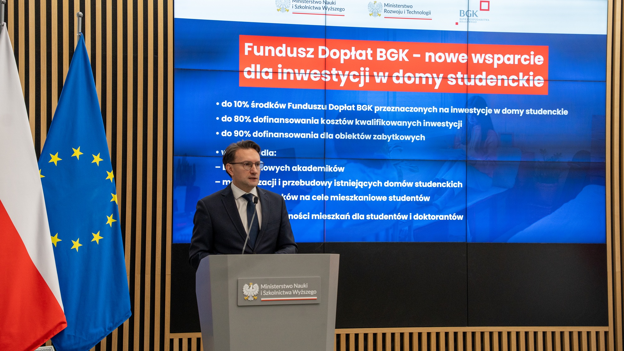 W konferencji uczestniczyli m.in. Tomasz Lewandowski, podsekretarz stanu w Ministerstwie Rozwoju i Technologii, a także sekretarz stanu w MNiSW Marek Gzik oraz prezes zarządu Banku Gospodarstwa Krajowego Mirosław Czekaj i prorektor Uniwersytetu Warszawskiego Maciej Raś – przedstawiciel uczelni, która złożyła już wniosek o dofinansowanie. – Dostrzegliśmy, że domy studenta nie są tylko infrastrukturą akademicką i instrumentem wyrównywania szans edukacyjnych dla studentów i doktorantów. Są integralną częścią ekosystemu mieszkalnictwa miejskiego i powinny móc korzystać z instrumentów dofinansowania dla budownictwa komunalnego czy społecznego. Studenci na co dzień borykają się z takimi samymi problemami, jak polskie rodziny i nasz program to uwzględnia – mówił Tomasz Lewandowski. Z kolei Mirosław Czekaj zwracał uwagę na fakt rozszerzenia funkcjonującego dotychczas systemu. – Możemy powiedzieć, że po 20 latach funkcjonowania programu budownictwa społecznego i komunalnego, mamy w nim nowy element i nową jakość. To środki na budowę i modernizację domów studenckich – 10 proc. w ramach Funduszu Dopłat BGK będzie trafiać do studentów. Jest to o tyle istotne, że budowanie konkurencyjności, to również dbanie o szkolnictwo wyższe – powiedział przedstawiciel BGK. Wiceminister nauki i szkolnictwa wyższego Marek Gzik zaapelował do wszystkich rektorów o składanie wniosków o dofinansowanie, zaznaczając przy tym, że ministerstwo pozostaje otwarte na wszelkie sugestie środowiska i być może w kolejnych edycjach programu będzie dochodzić do jego modyfikacji.
