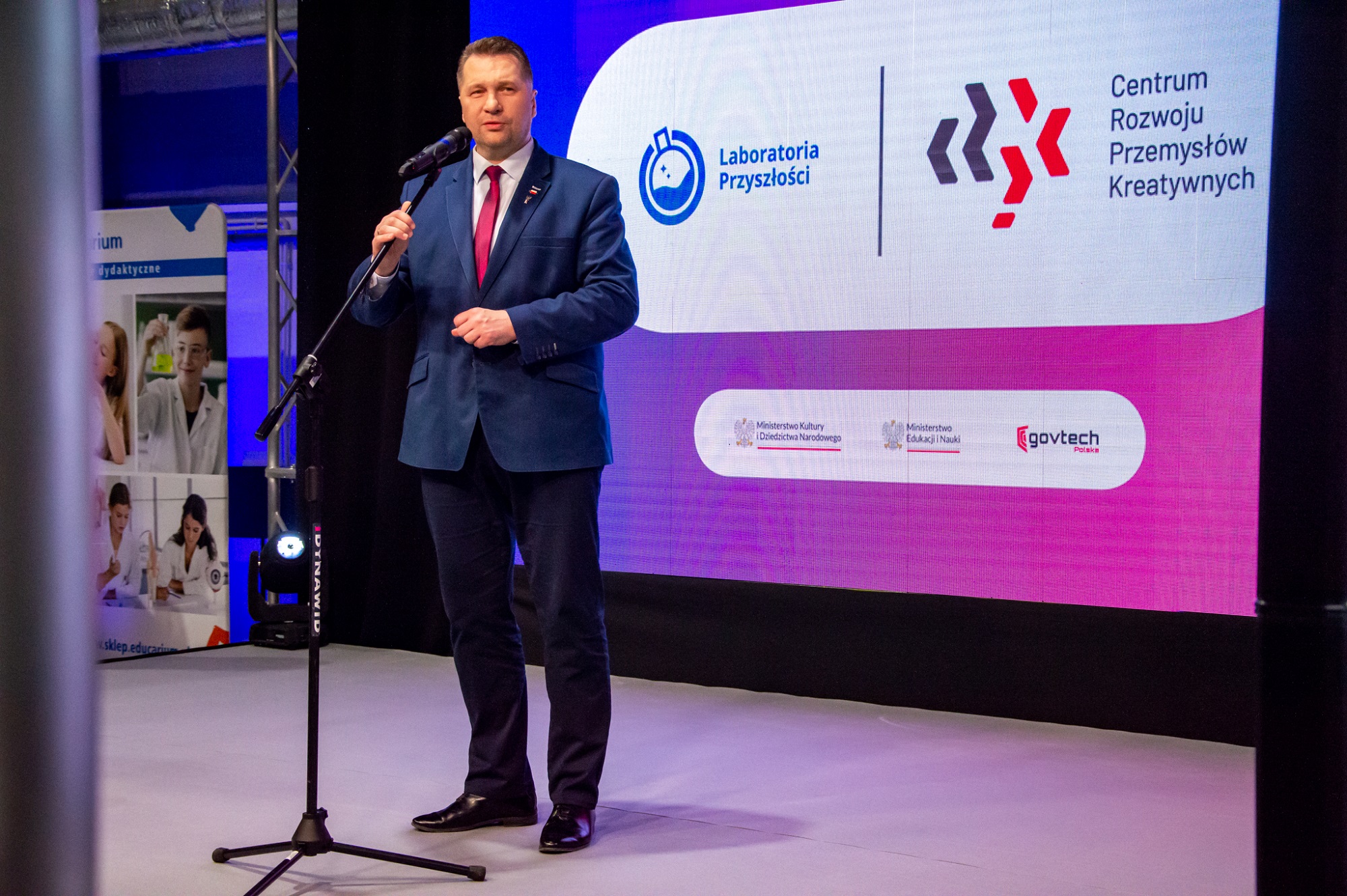 – Jesteśmy w Centrum Rozwoju Przemysłów Kreatywnych, które można nazwać dzisiaj „Laboratorium Przyszłości” w wersji premium – mówił minister Przemysław Czarnek. – Od ponad roku prowadzimy z panią minister Justyną Orłowską i jej zespołem projekt o wartości 1,2 mld zł unowocześnienia polskich szkół i przeniesienia ich w przyszłość już dziś. W każdej szkole podstawowej w Polsce jest dziś „Laboratorium Przyszłości”, to znaczy nowoczesna pracownia techniczna, informatyczna z najnowocześniejszym sprzętem. Takich „Laboratoriów” nie ma w wiele krajach Europy Zachodniej – dodał minister.