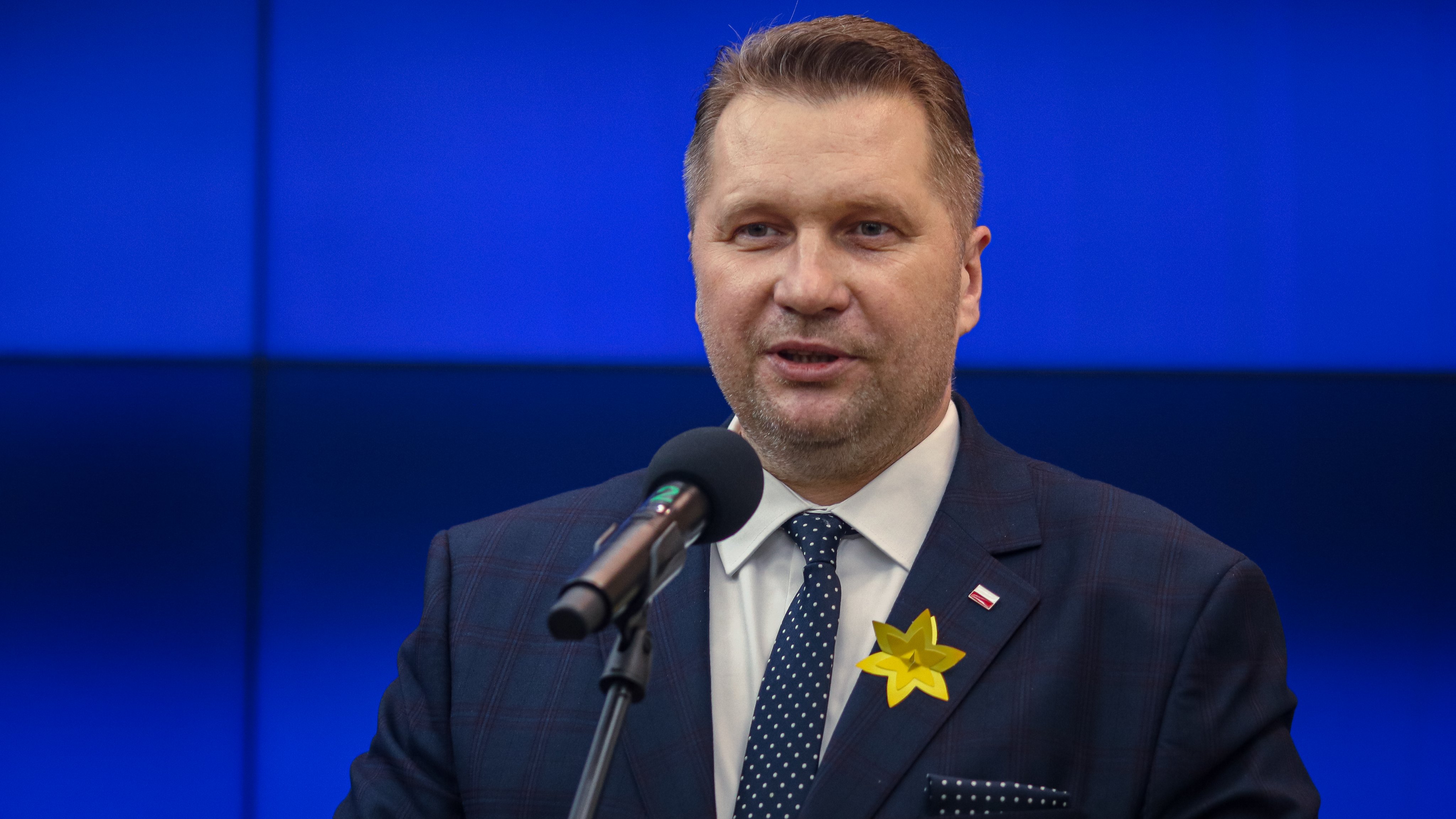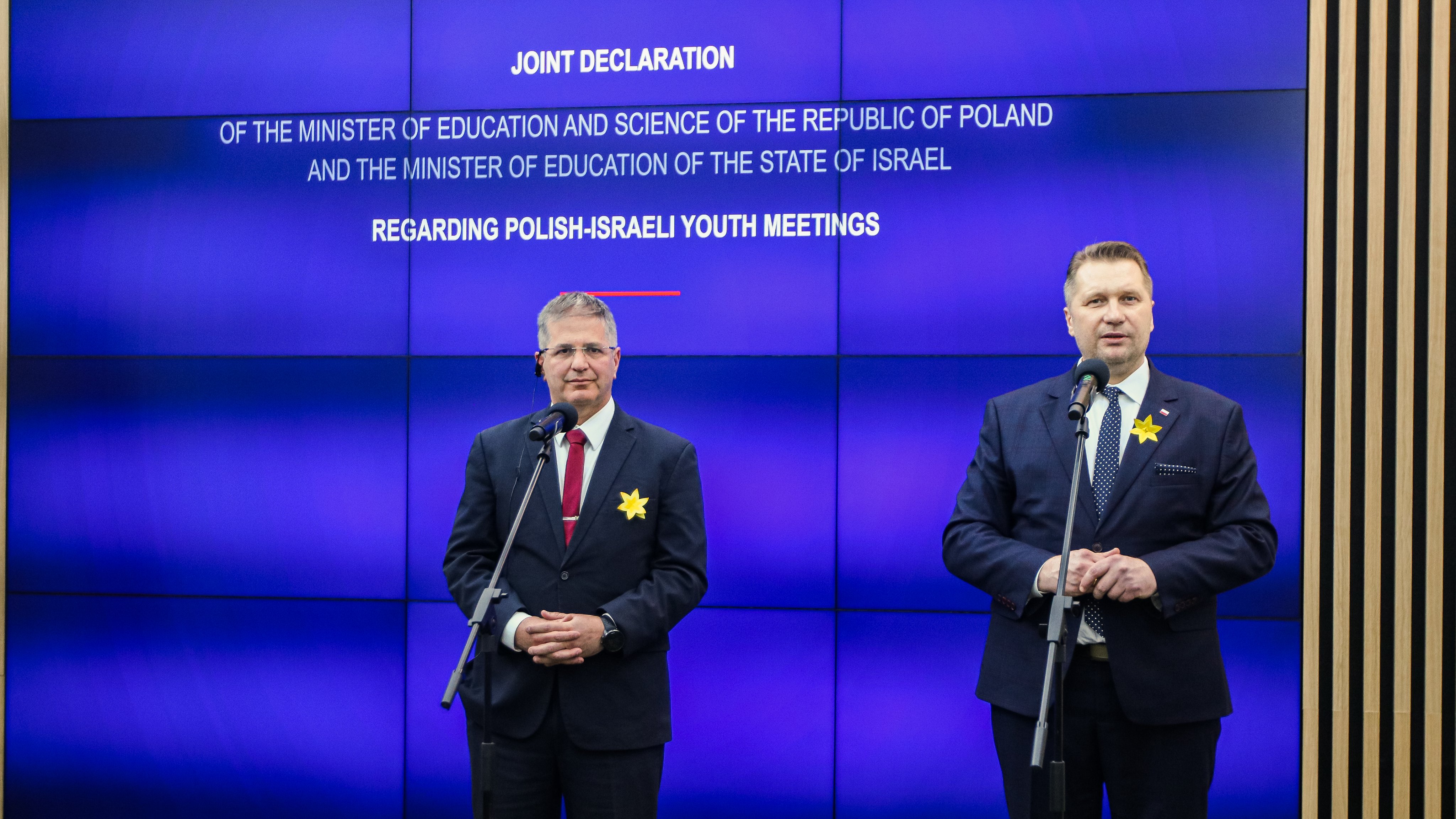 Minister Czarnek i mężczyzna w czarnym garniturze stoją przy mikrofonach na stojakach, obaj mają przypięte do garniturów żółte papierowe kwiaty, za nimi wielki telebim z napisem Joint declaration na niebieskim tle.