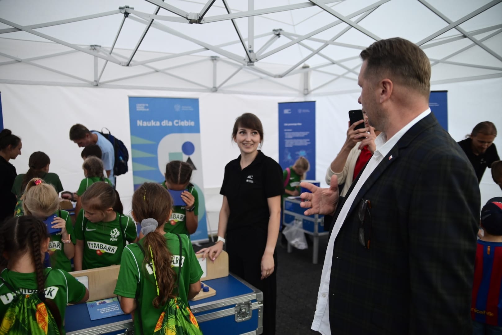 Wiele atrakcji naukowych czekało na uczniów, którzy w ramach przedsięwzięcia „Poznaj Polskę na sportowo” przyjechali kibicować naszej drużynie podczas meczu Polska –Wyspy Owcze na Stadionie Narodowym. Jeszcze przed pierwszym gwizdkiem mogli wziąć udział w warsztatach Mobilnych Laboratoriów Przyszłości, obejrzeć film w technologii VR i poeksperymentować w Naukobusie. Młodych pasjonatów sportu i nauki na przedmeczowym pikniku odwiedził minister Przemysław Czarnek.