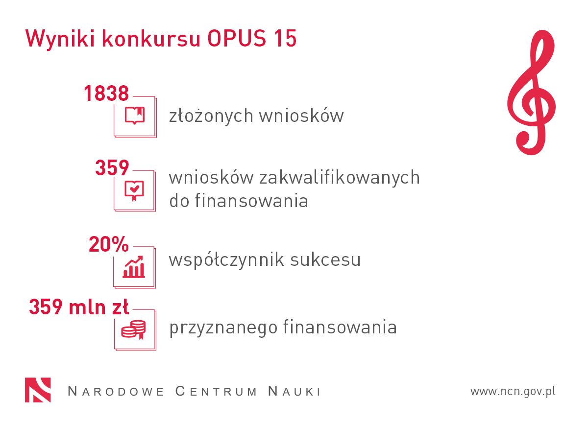 W konkursie OPUS 15 najwięcej, bo aż 693 wnioski nadesłano w grupie nauk ścisłych i technicznych. Wsparcie finansowe w łącznej wysokości prawie 137 mln zł przyznano 135 projektom. W grupie nauk o życiu zgłoszonych zostało 596 wniosków, spośród których do finansowania zakwalifikowano 115 projektów o wartości ponad 170 mln zł. W naukach humanistycznych, społecznych i o sztuce nadesłano 549 wniosków, z czego finansowanie w wysokości ponad 51 mln zł otrzymało 109 projektów.