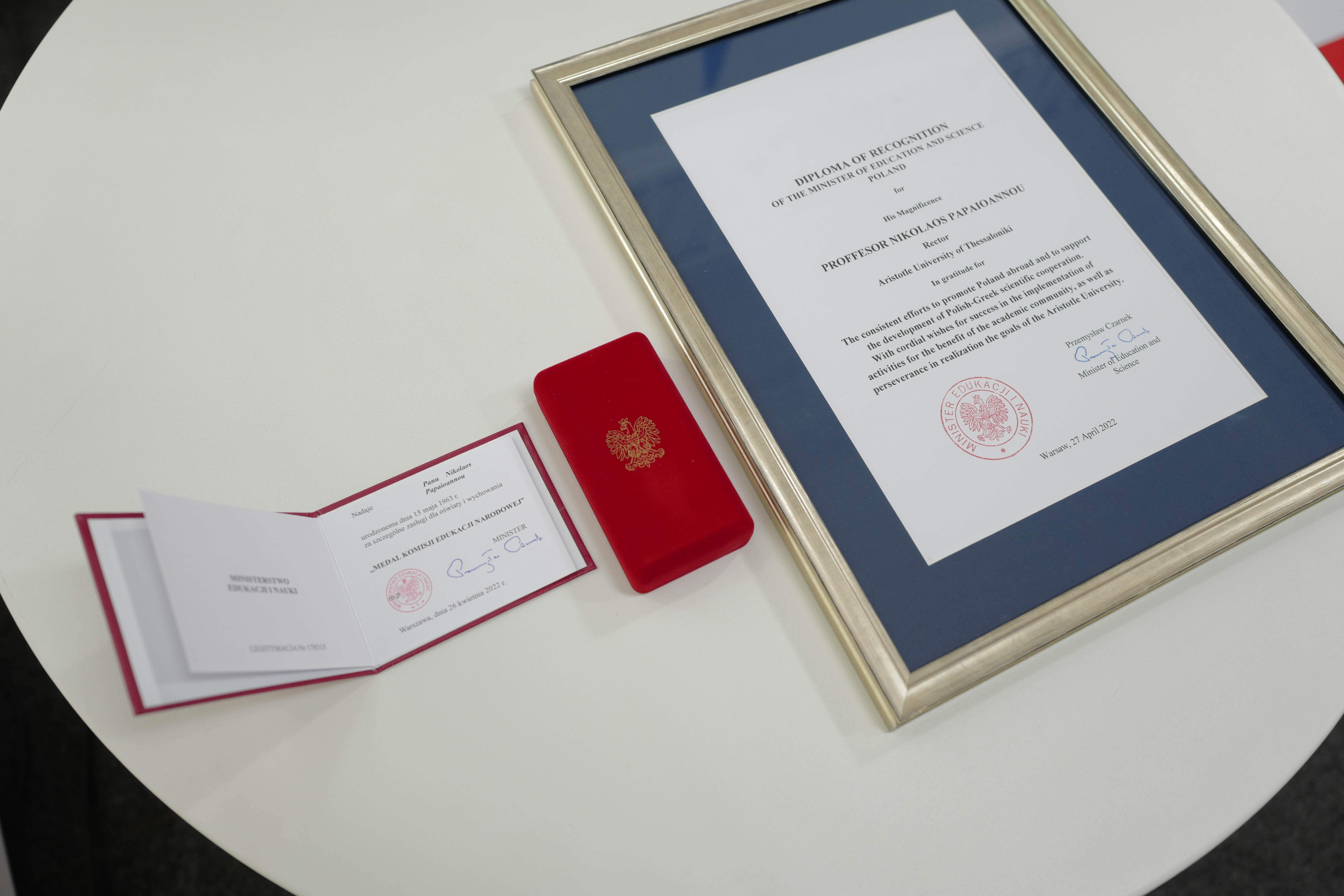 Minister Przemysław Czarnek odznaczył medalem KEN Rektora Uniwersytetu Arystotelesa w Salonikach prof. Nikolaosa Papaioannou.