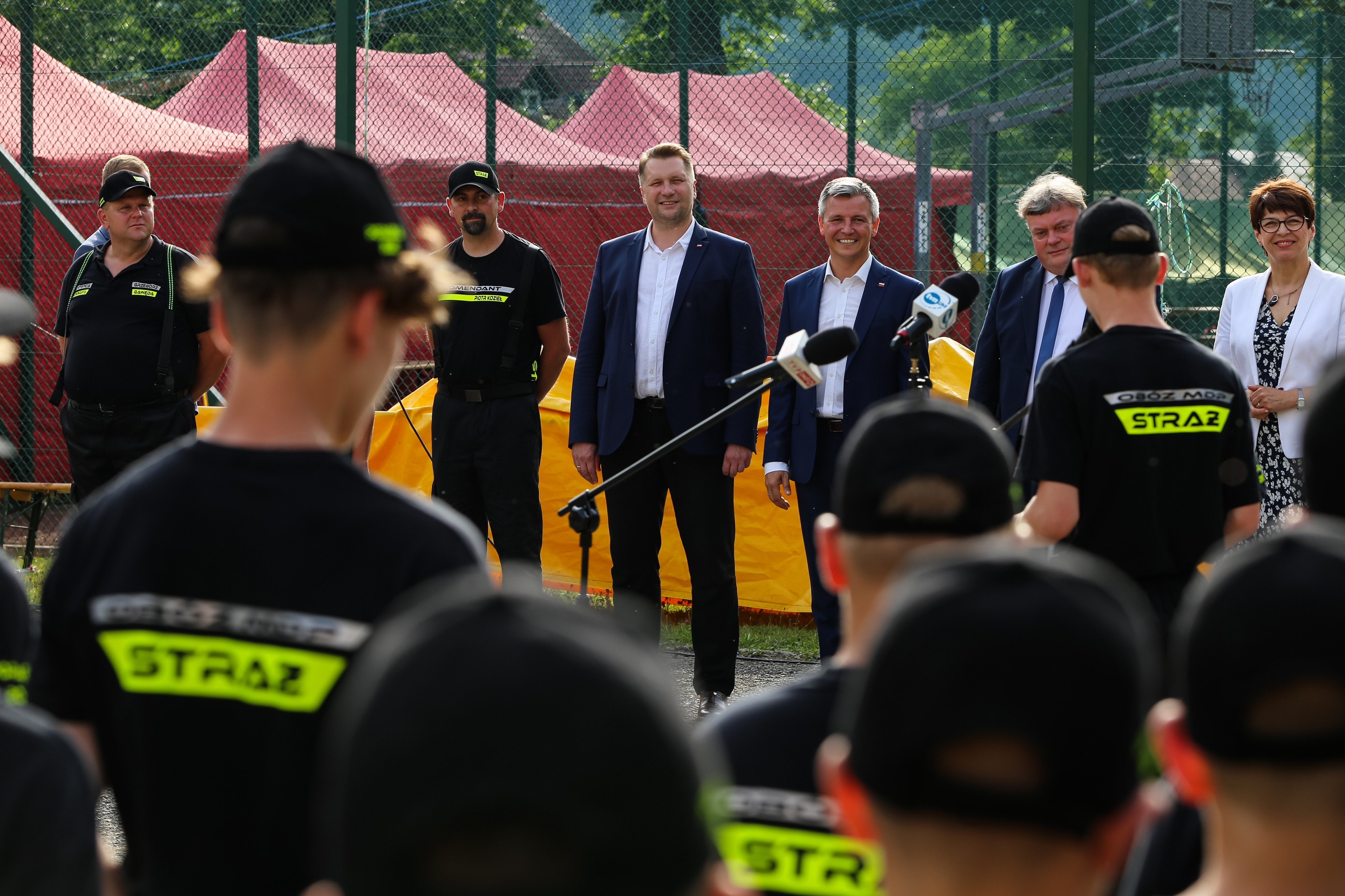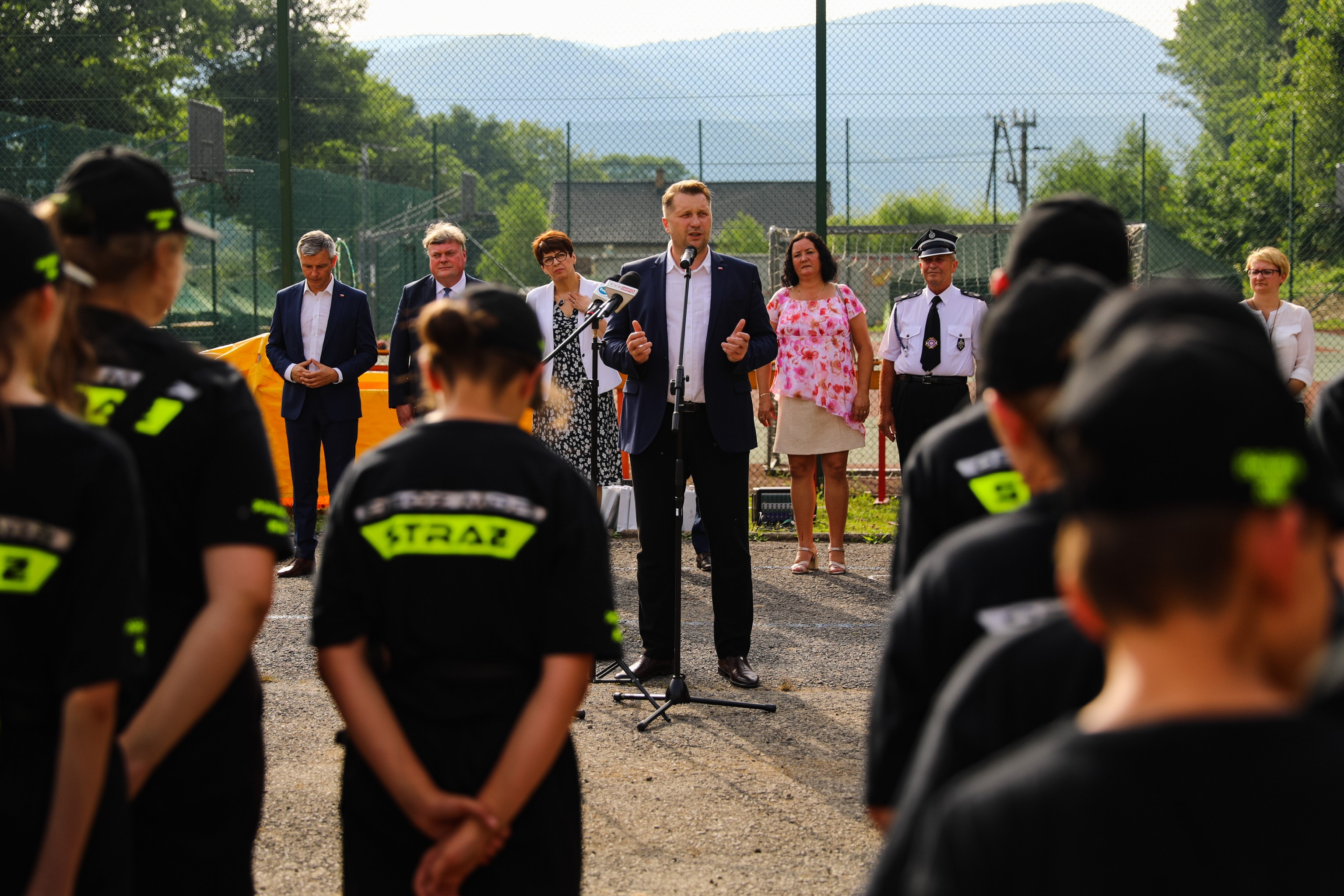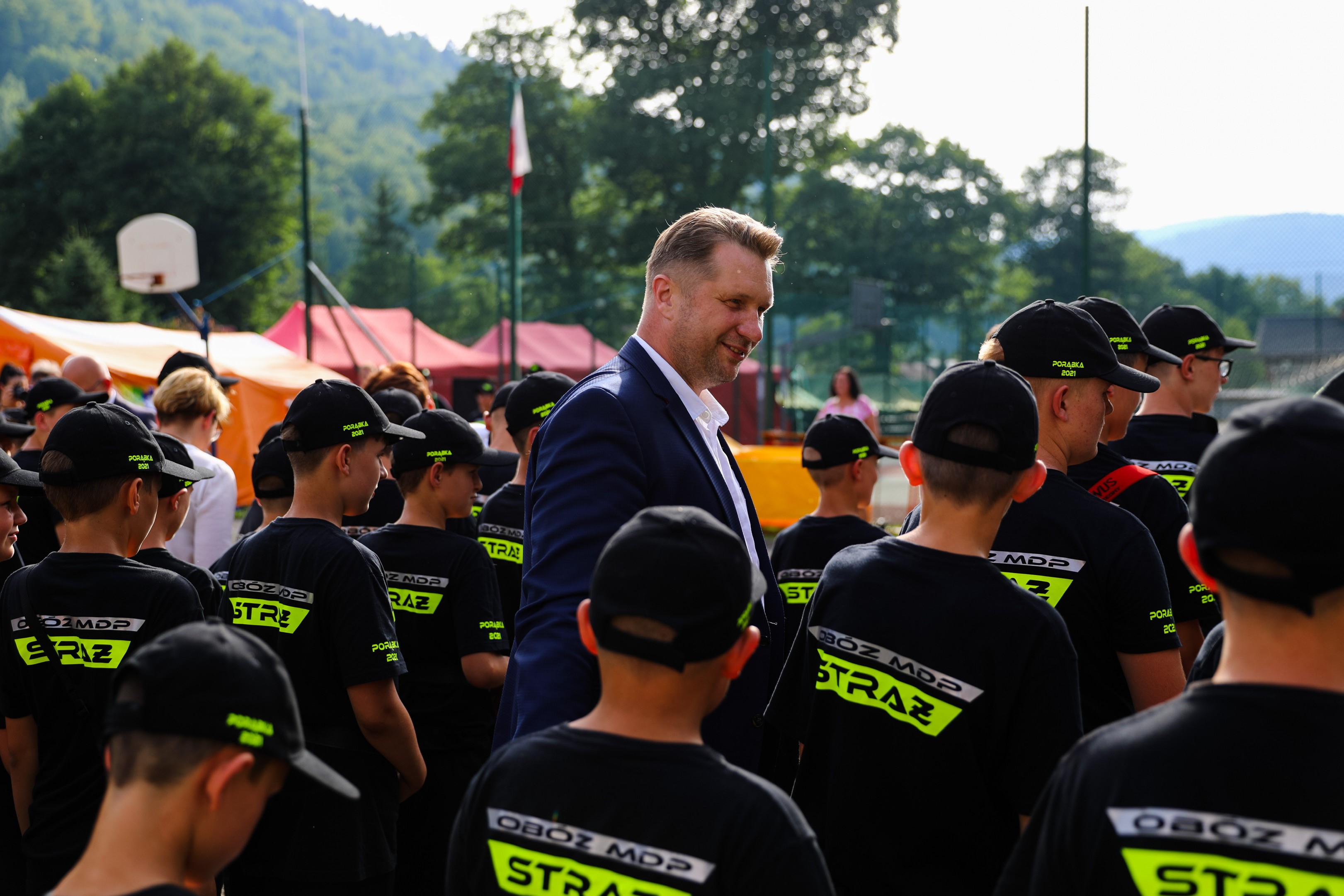 Spotkanie ministra Przemysława Czarnka z przedstawicielami Młodzieżowych Drużyn Pożarniczych na obozie w Porąbce