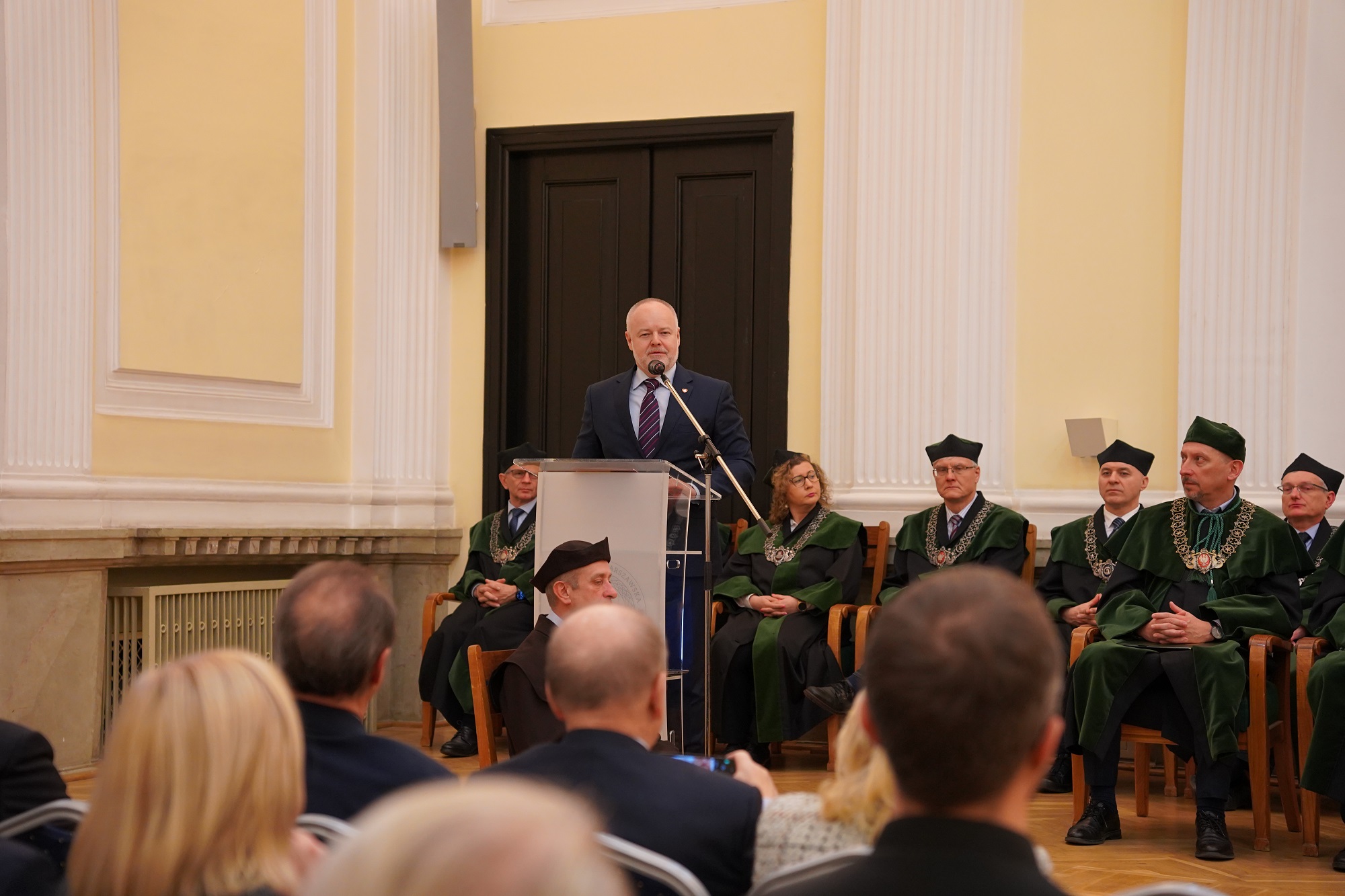 – Proszę przyjąć wyrazy uznania i wdzięczności dla osiągnięć całej społeczności akademickiej. Gratuluję wieloletniej działalności przepełnionej sukcesami. Dziękuję za wszystko, co państwo realizują w zakresie kształcenia, prowadzenia badań naukowych, ale przede wszystkim za wkład, który służy rozwojowi naszego kraju. Przed nami wiele wyzwań. Znajdujemy się w okresie głębokiej transformacji gospodarczej, szczególnie energetycznej. Taki proces wymaga od środowiska naukowego ogromnego zaangażowania, a jego powodzenie zależy w znacznym stopniu od współpracy nauki i biznesu. W tej dziedzinie uczelnie techniczne, w tym Politechnika Warszawska, mają niezwykle wiele do zaoferowania – mówił sekretarz stanu w MNiSW.