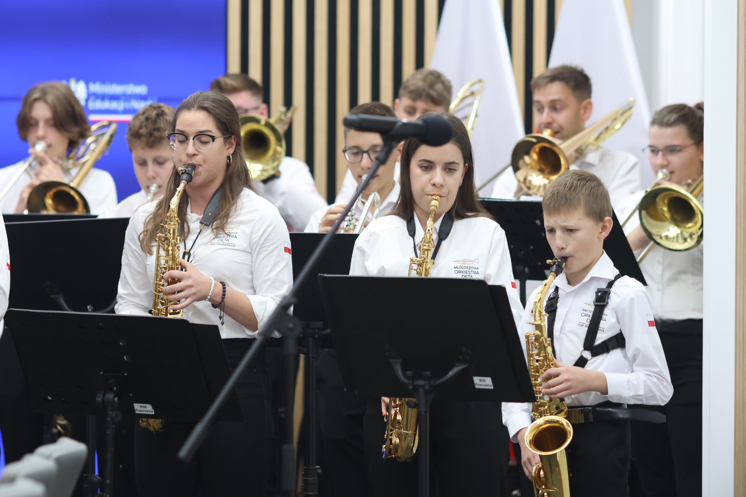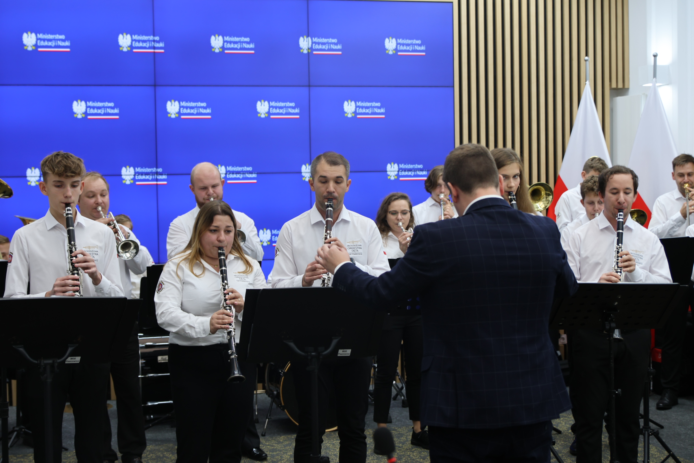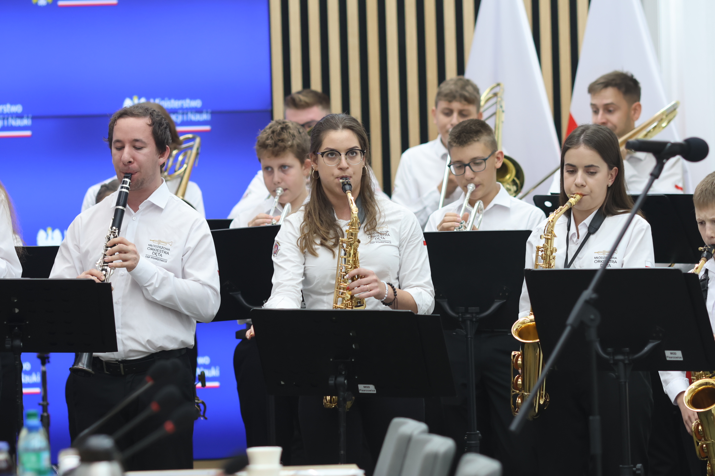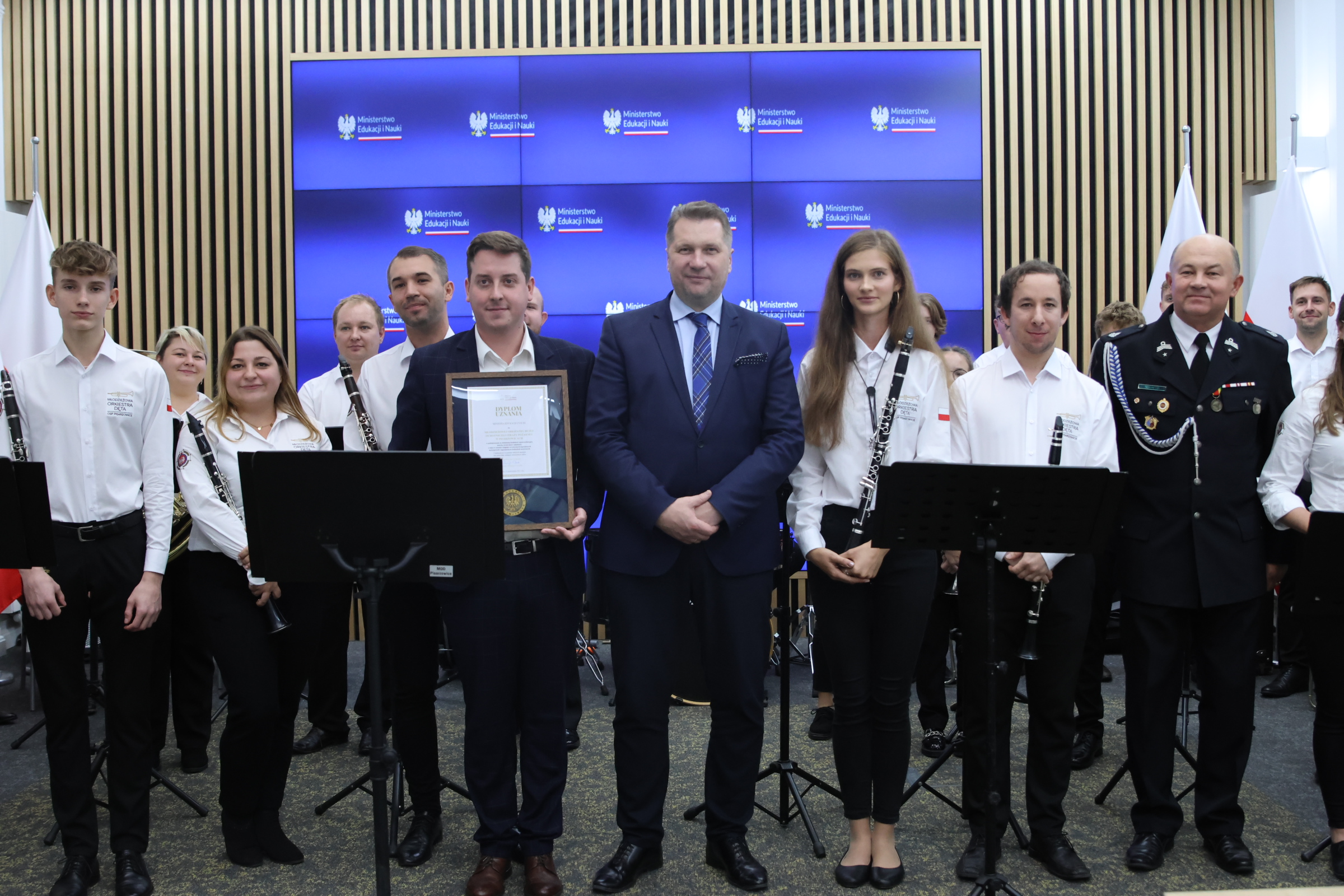 Minister Przemysław Czarnek spotkał się z artystami z Młodzieżowej Orkiestry Dętej Ochotniczej Straży Pożarnej z Pisarzowic, by pogratulować muzycznych sukcesów oraz zaangażowania w rozwój młodzieńczych pasji.