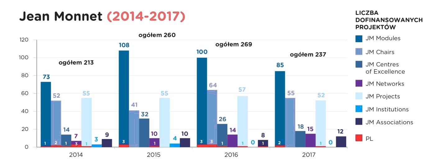 Udział polskich instytucji w działaniach Jean Monnet od początku programu Erasmus+: