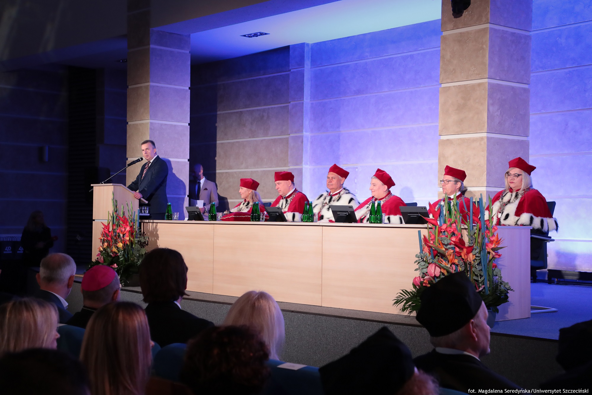 Szef MNiSW w swoim wystąpieniu podkreślił rolę nauki w rozwoju społeczeństwa, wyrażając pełne wsparcie dla działań podejmowanych przez szczecińską uczelnię. Zwrócił również uwagę na potrzebę wzmacniania współpracy z biznesem, co ma kluczowe znaczenie dla innowacji i przyszłości gospodarki. – Uniwersytet Szczeciński wspaniale się rozwija. Ci wszyscy, którzy przez ostatnie 40 lat budowali tę uczelnię, mogą być dumni z tego, czego dokonali. Chylę przed Państwem czoła za ten trud. Dzięki Państwa zaangażowaniu możliwe było stworzenie miejsca, które jest tak istotne dla regionu zachodniopomorskiego, ale też dla całej Polski. To wielka sprawa i wielki jubileusz – mówił szef MNiSW.