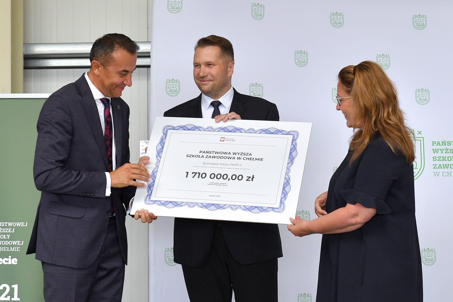 - Chełm kojarzy się dzisiaj i jest symbolem rozwoju województwa lubelskiego od co najmniej kilku lat. Ten modelowy rozwój dotyczy zarówno samego miasta, jak i uczelni PWSZ w Chełmie – powiedział minister Przemysław Czarnek. - Mamy zaszczyt być świadkami tego wielkiego rozwoju. Możemy dziś obejrzeć potężne inwestycje, które nie towarzyszyły temu miastu i regionowi jeszcze parę lat temu. Dziś są to inwestycje liczone w setkach milionów złotych. Będziemy patrzeć, szczycić się tym rozwojem i cały czas go wspierać. Na dowód tego, że chcemy pomagać i pomagamy, z okazji uroczystości otwarcia pasa startowego i 20-lecia PWSZ, przekazuję symboliczny czek na kwotę 1 710 000,00 zł na nowy symulator lotów dla uczelni. Serdecznie gratuluję – dodał minister.
