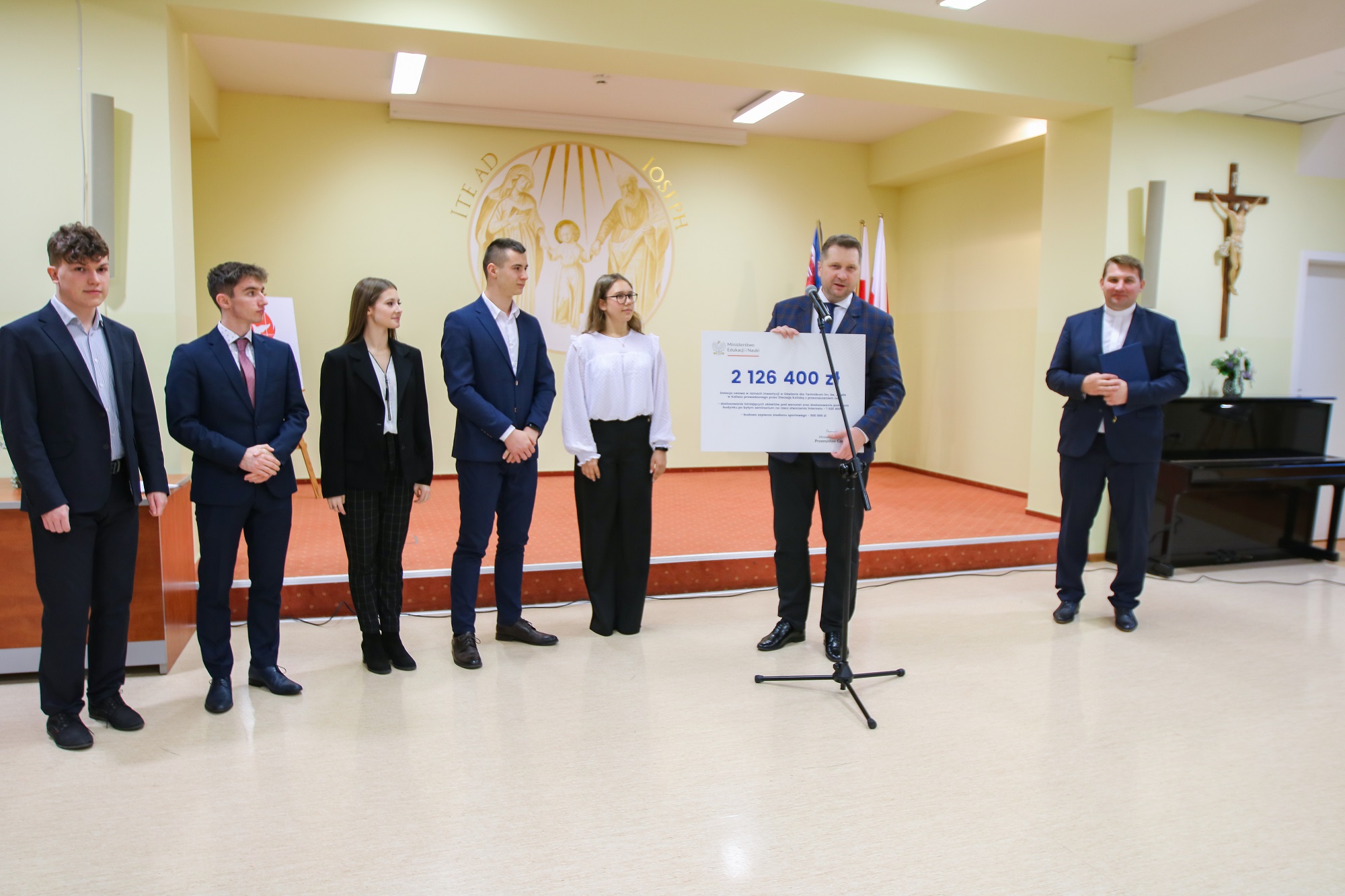 Minister Edukacji i Nauki odwiedził Technikum im. Świętego Józefa w Kaliszu. To kolejna placówka, która uzyskała dofinansowanie z programu „Inwestycje w oświacie”. Podczas wizyty szef MEiN przekazał szkole symboliczny czek na kwotę ponad 2 mln zł. To środki, które zostaną przeznaczone na dostosowanie obiektów pod warsztaty i internat oraz na budowę zaplecza stadionu sportowego.