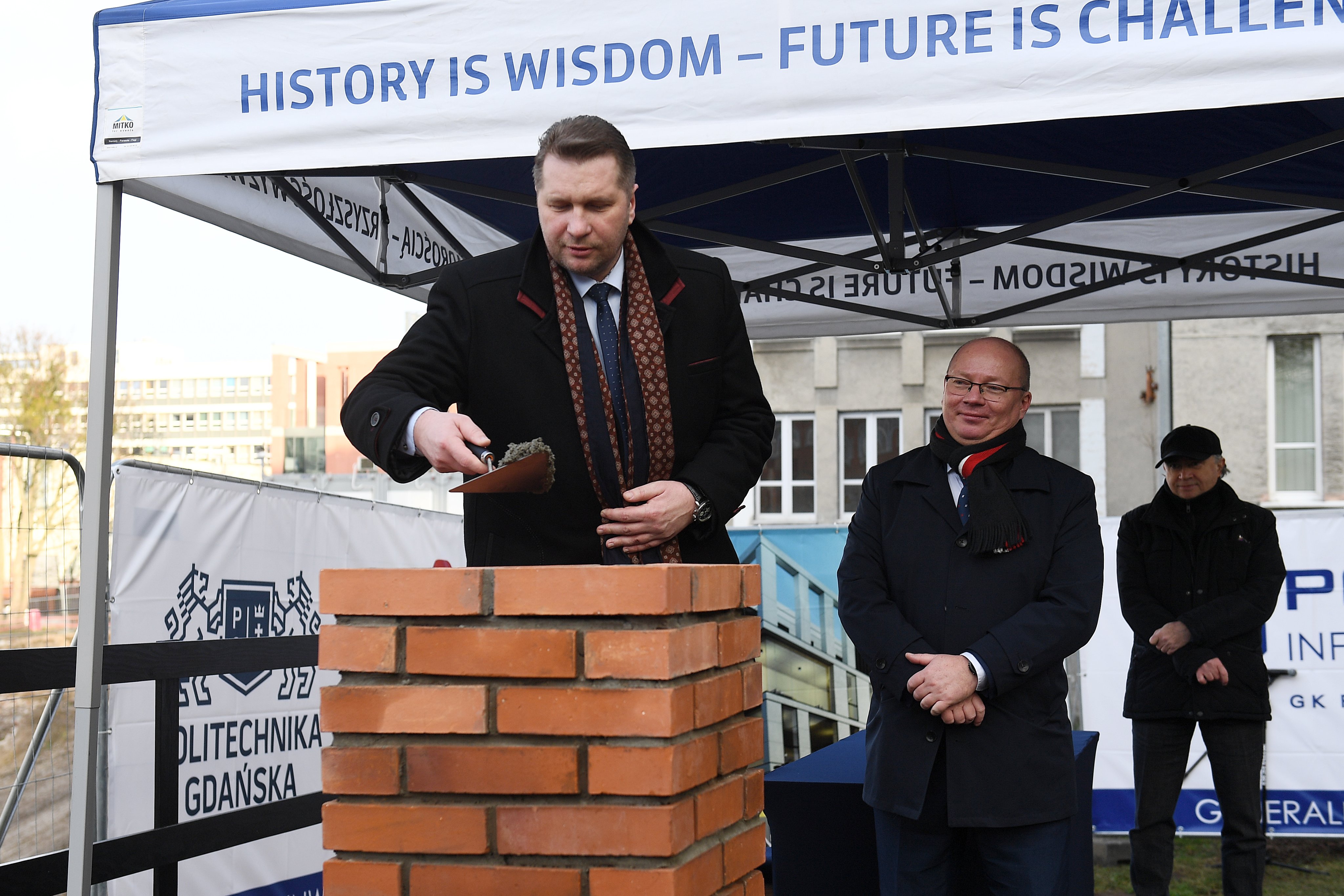 W piątek, 26 listopada br. Minister Edukacji i Nauki Przemysław Czarnek wziął udział w uroczystości wmurowania kamienia węgielnego pod Centrum Ekoinnowacji na Politechnice Gdańskiej. Podczas wydarzenia szef MEiN przekazał także gdańskim uczelniom czeki o łącznej wartości prawie 25 mln zł na realizację inwestycji oraz działań rozwojowych i badawczych.