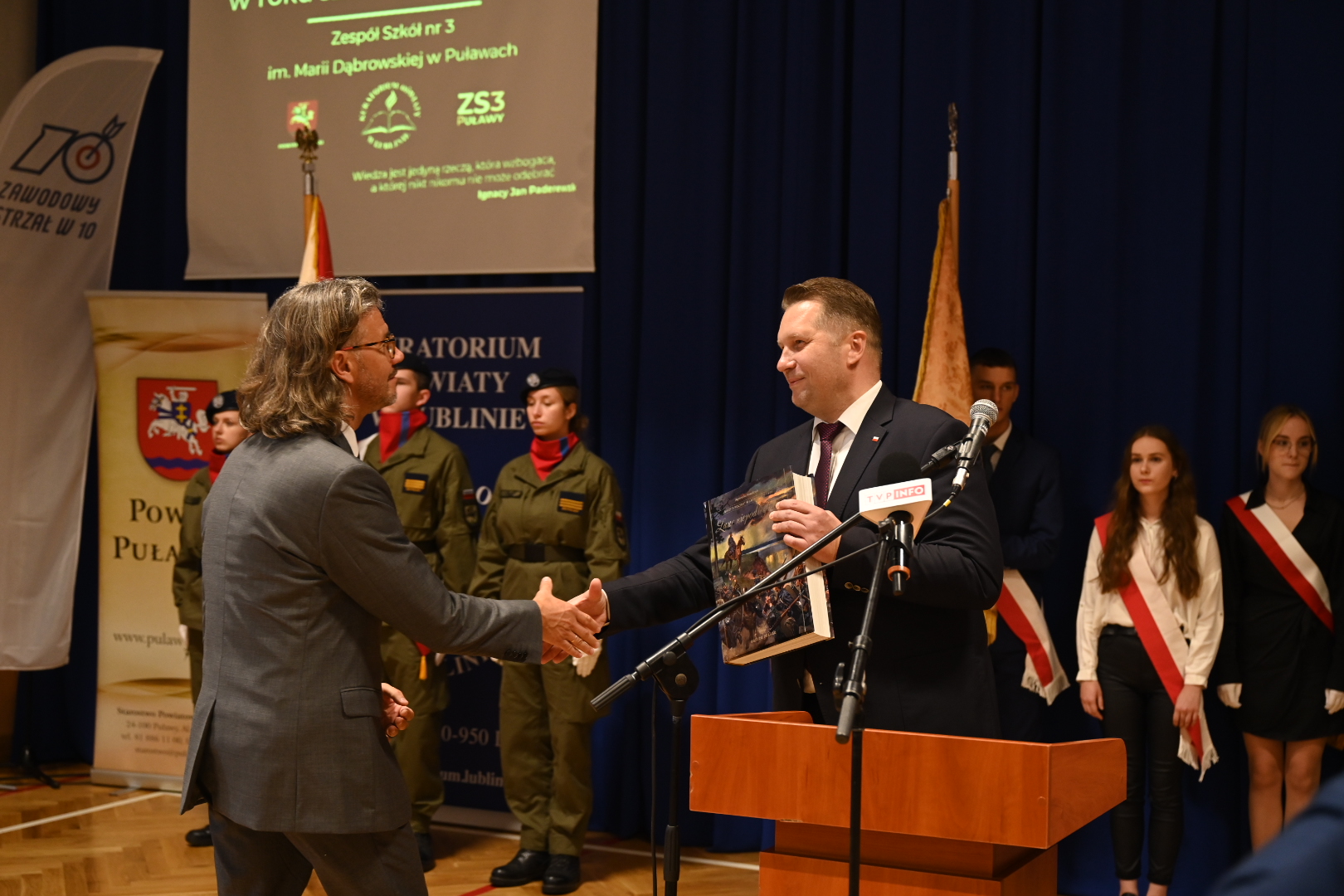 W trakcie uroczystości szef MEiN wręczył Dyplom Laur Niepodległości panu Grzegorzowi Jabłońskiemu, dyrektorowi Zespołu Szkół nr 3 w Puławach.