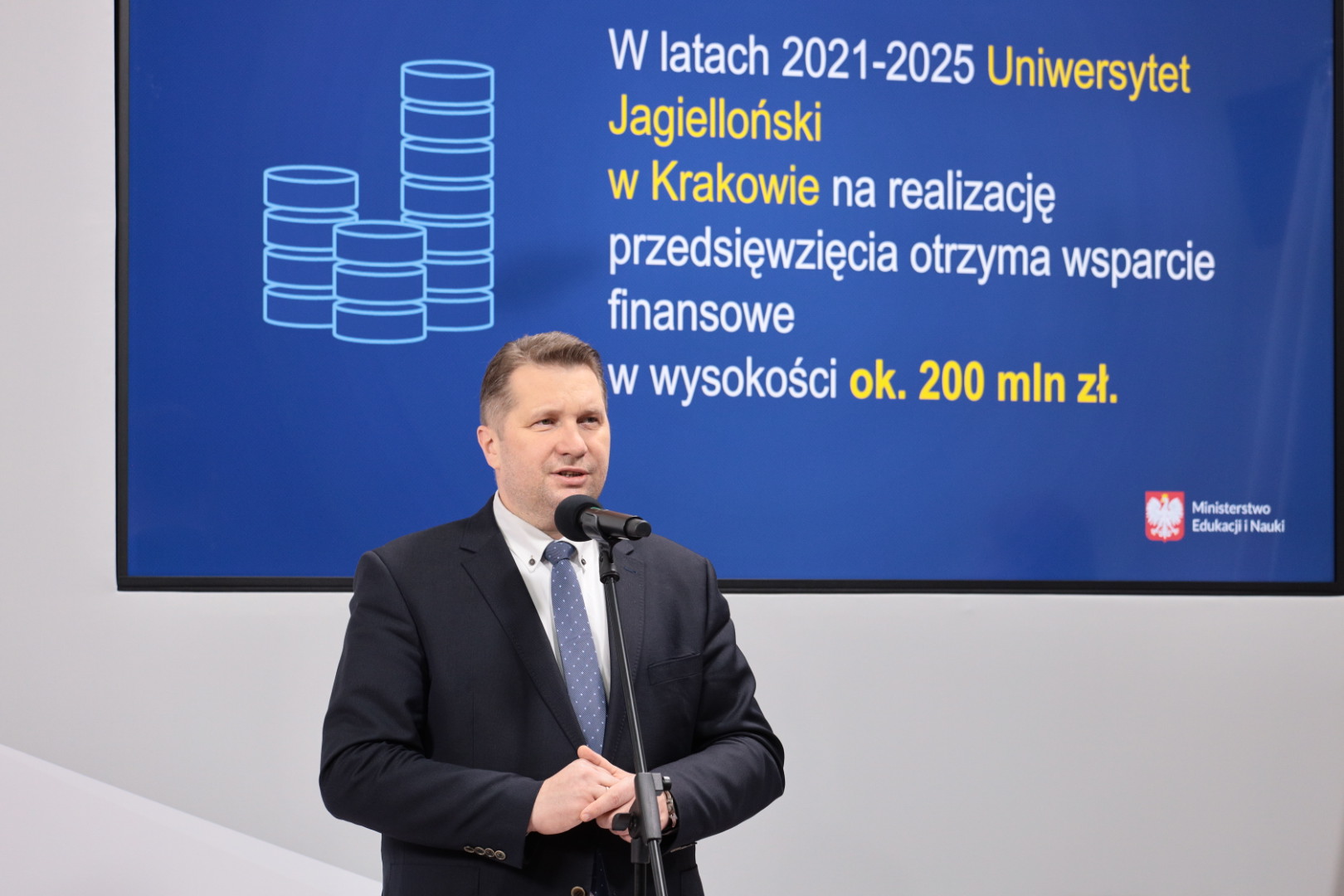 - Chcemy dziś przekazać konkretne pieniądze, które będą wsparciem badań naukowych w ramach Narodowego Centrum Promieniowania Synchrotronowego SOLARIS. Kwota 200 mln zł będzie przeznaczona na realizację tego przedsięwzięcia w latach 2021 – 2025. Gratuluję rektorowi Uniwersytetu Jagiellońskiego i życzę efektywnego wykorzystania tych środków finansowych – powiedział minister podczas konferencji.