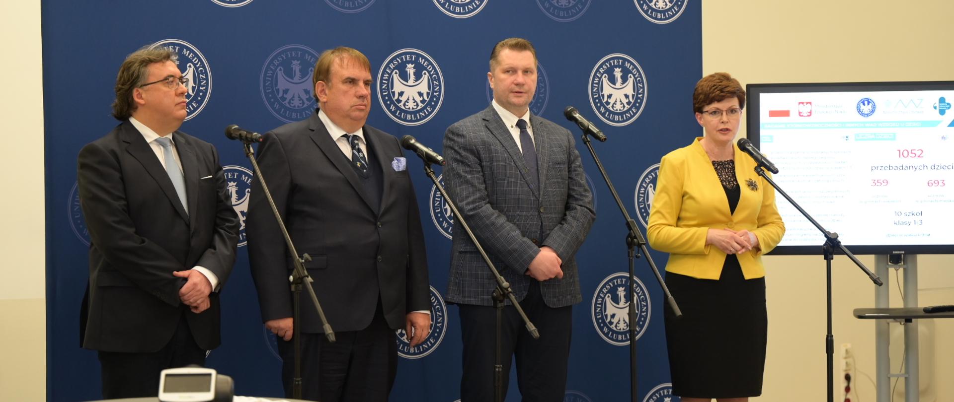 Wyniki pilotażu wspólnie z Ministrem Edukacji i Nauki przedstawili: Rektor Uniwersytetu Medycznego w Lublinie prof. dr hab. n. med. Wojciech Załuska, Prorektor UM w Lublinie ds. Umiędzynarodowienia, Cyfryzacji i Promocji prof. dr hab. n. med. Robert Rejdak oraz Lubelska Kurator Oświaty Teresa Misiuk.