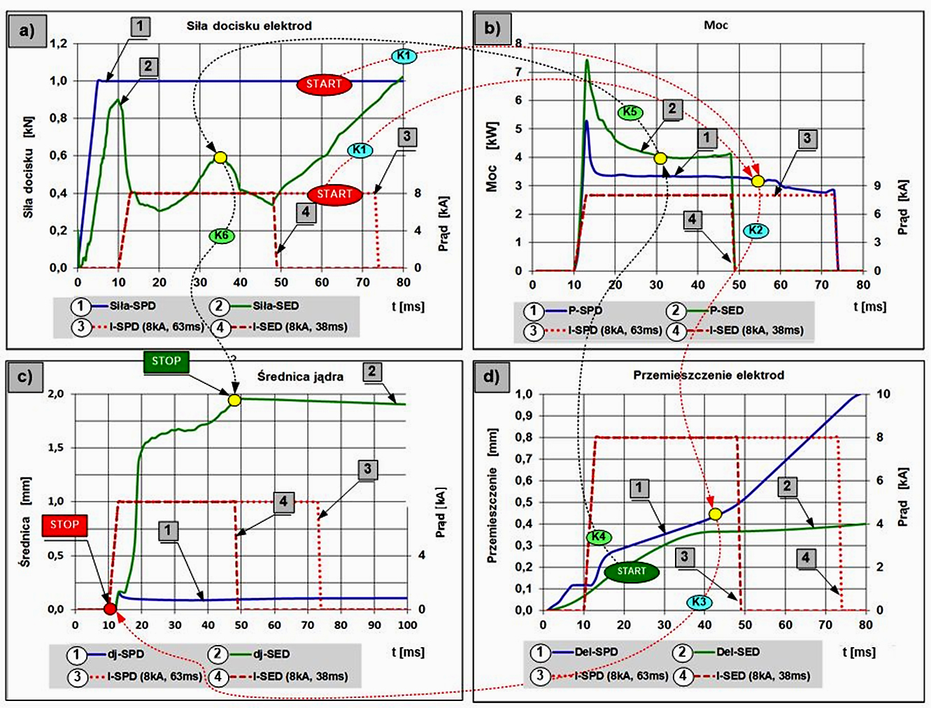 Examples of resistance welding technology comparing the process for two different electrode clamping systems of a resistance welding machine, i.e. the pneumatic SPD clamping system - a conventional system and the electromechanical clamping system SED - an innovative system developed under the TANGO project: