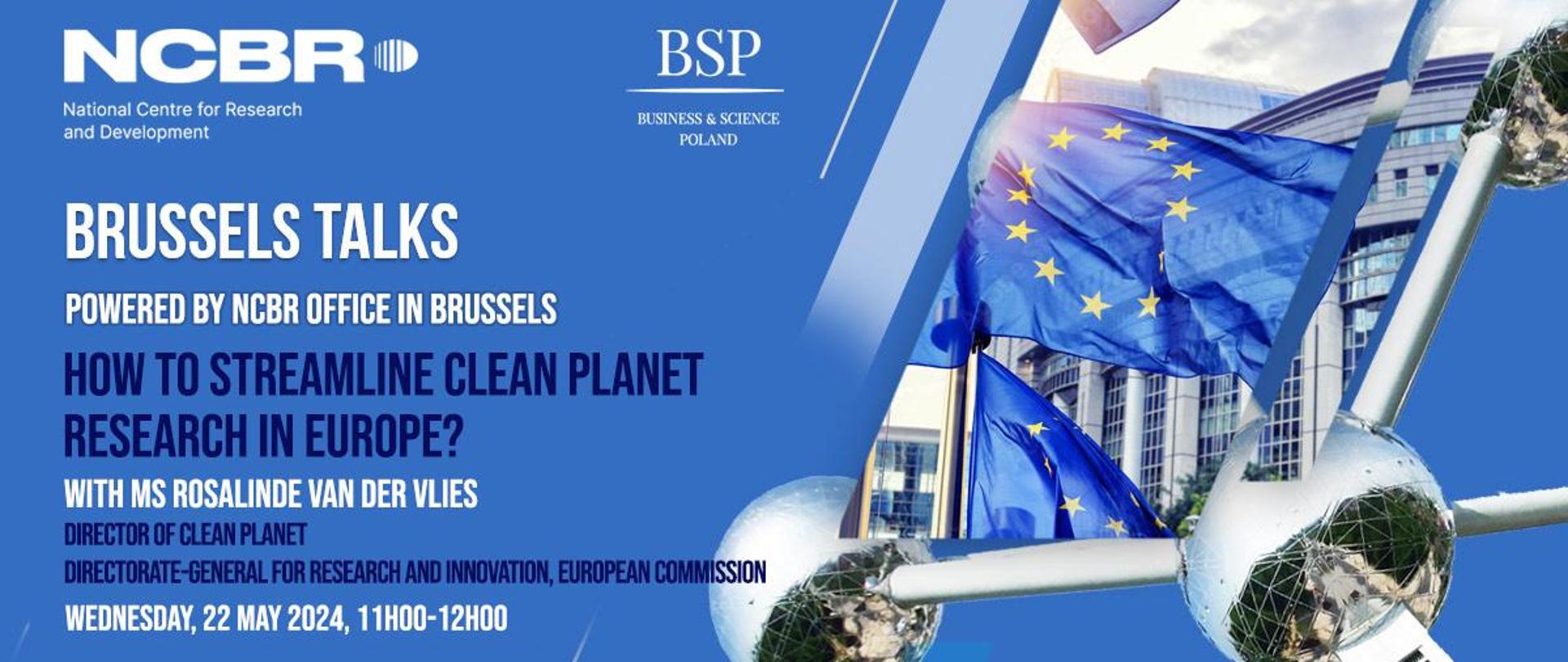 In the framework of „Brussels Talks” series, organized by the NCBR Office in Brussels | Business & Science Poland, we cordially invite you to join another meeting – the topic in May is Clean Planet research and our distinguished guest is Rosalinde van der Vlies, Director of Clean Planet, DG RTD, European Commission. The event takes place on Wednesday, 22nd of May 2024, 11:00-12:00.