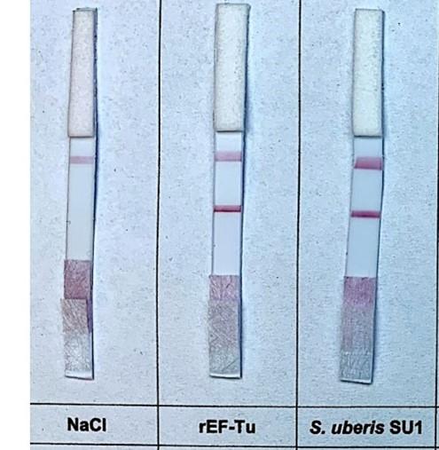 Fig. Example result of the immunochromatographic test prototype for detecting S. uberis bacteria. Key: NaCl – negative control, rEF-Tu – positive control, S. uberis SU1 – positive test result for the presence of S. uberis in cow milk.