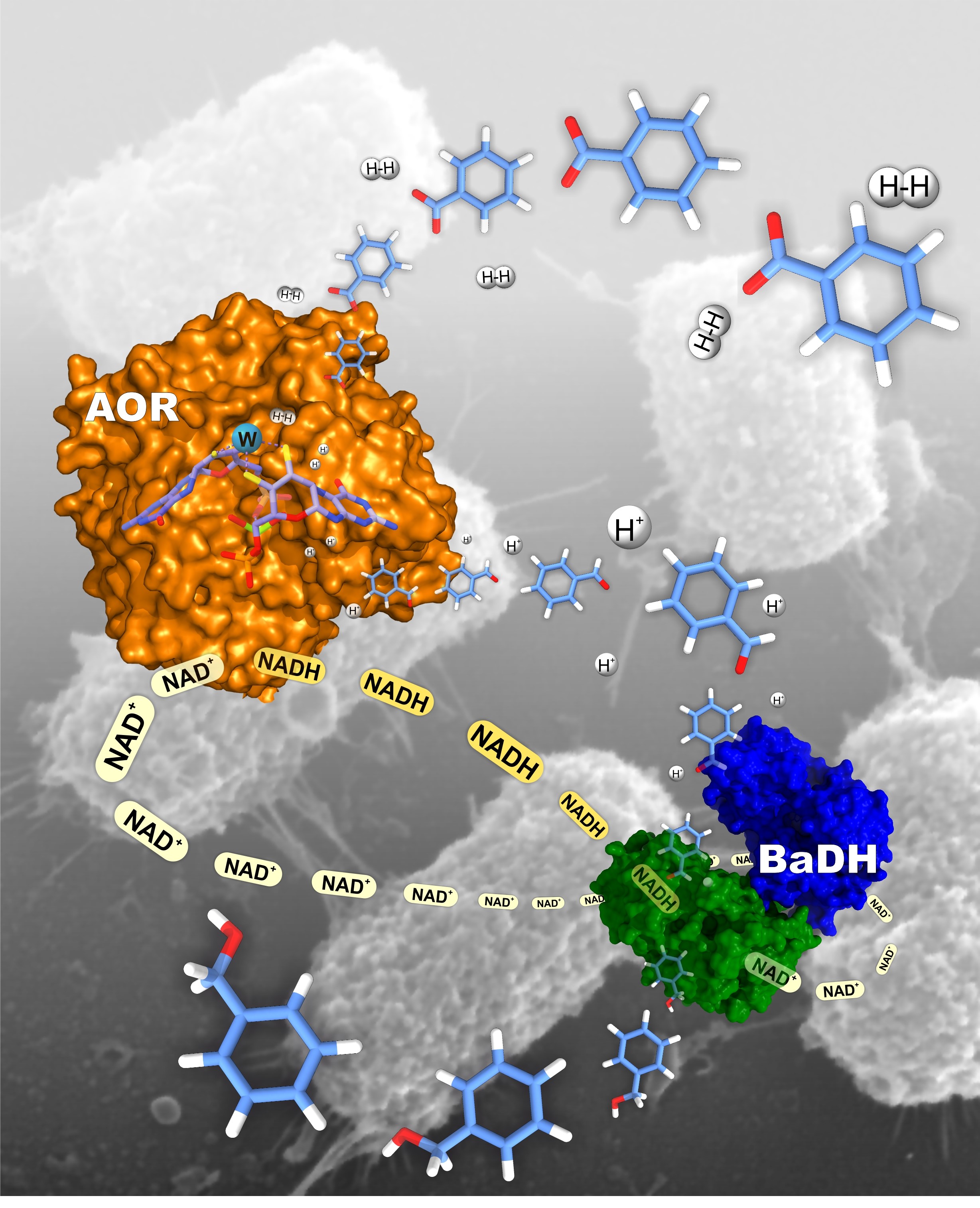 The use of enzymes as biocatalysts in production processes allows to reduce the applied temperatures and pressures and increase the selectivity of the synthesis method in relation to chemical methods. As a result, processes can be cheaper (less energy-intensive) and their products can have a smaller carbon footprint and higher purity. The main objective of the project was to use oxidoreductases derived from the bacterium Aromatoleum aromaticum for the production of bioalcohols from carboxylic acids. The enzymes were tungsten aldehyde oxidoreductase (AOR) and benzyl alcohol dehydrogenase (BaDH). The activities of both enzymes were studied in detail, resulting in the discovery of new AOR activity as hydrogenase. The AOR enzyme in the presence of hydrogen was found to catalyze the reduction of carboxylic acids to aldehydes or the reduction of oxidized nicotinamide adenine dinucleotide (NAD+) to its reduced form (NADH).