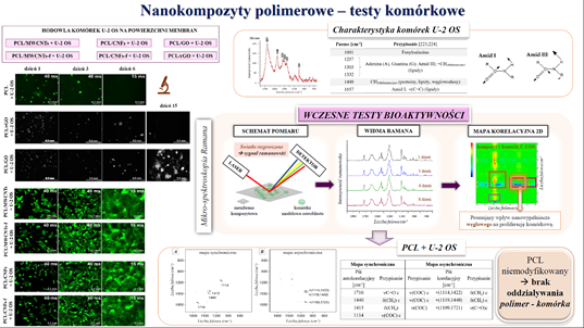 and cells under in vitro conditions. The high applicability of Raman spectroscopy as a method used to characterise materials in terms of their engineering, chemical and biological properties has been demonstrated. - The tested nanocomposites were successively subjected to biological tests - in vitro proliferation of osteoblast-like U-2 OS cells. The same test method - Raman micro-spectroscopy - was used to analyse the complex system and interactions in the interphase region. This study proposes a method for early assessment of the nanocomposite material bioactivity - by using the 2D correlation spectroscopy technique. The method of 2D-COS correlation spectroscopy uses advanced mathematical apparatus and makes it possible to identify early changes appearing at the phase boundary of a complex system between a cell and a biomaterial already in the first week of cell culture on the membrane surface. It appears that this detection method in many cases is well ahead of the observation concerning the differentiation assessed by standard fluorescence microscopy. This is therefore a unique way of using the Raman spectroscopy technique to study the biological activity of materials.