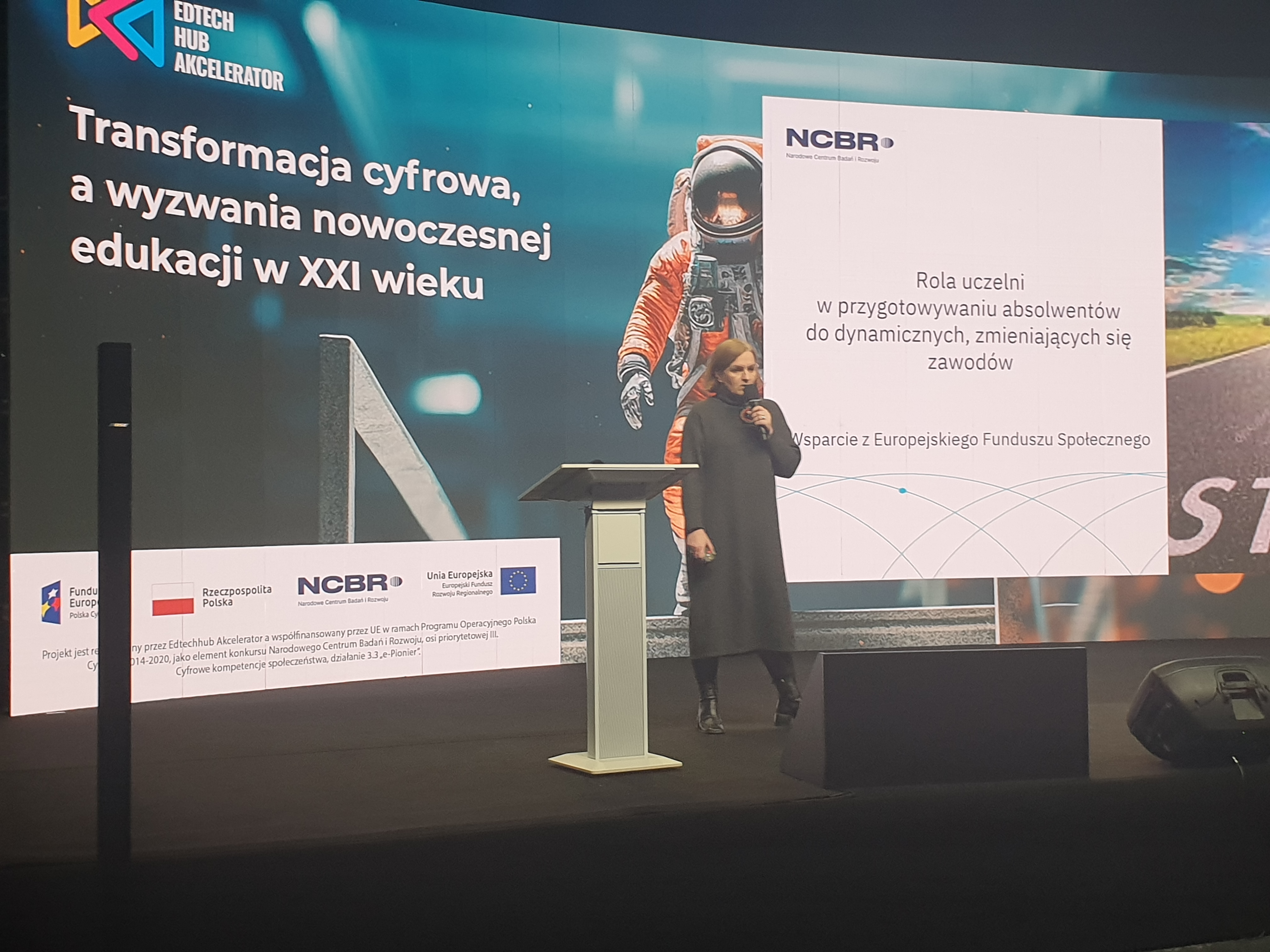 Ogłoszona w maju br. inicjatywa znajduje już odzwierciedlenie w pierwszych konkursach realizowanych przez NCBR w ramach programu Fundusze Europejskie dla Rozwoju Społecznego, takich jak „Rozwój kwalifikacji i kompetencji osób dorosłych”, „Kształcenie na potrzeby gospodarki”, „Kształcenie na potrzeby branż kluczowych” czy „Rozwój kwalifikacji i kompetencji kadry realizującej dydaktykę”. Zwróciła na to uwagę Anna Marciniak, kierownik Sekcji Programów EFS z Działu Dotacji Krajowych i Funduszy UE w Narodowym Centrum Badań i Rozwoju, która zabrała głos w panelu „Kwalifikacje przyszłości a aktywna rola uczelni w zakresie wypełniania potrzeb rynku”. Nasza ekspertka skupiła się na odpowiedzialności uczelni za dobre przygotowanie absolwentów do zmieniających się zawodów, podając przykłady działań NCBR, które wspierają szkolnictwo wyższe w tym zakresie.
